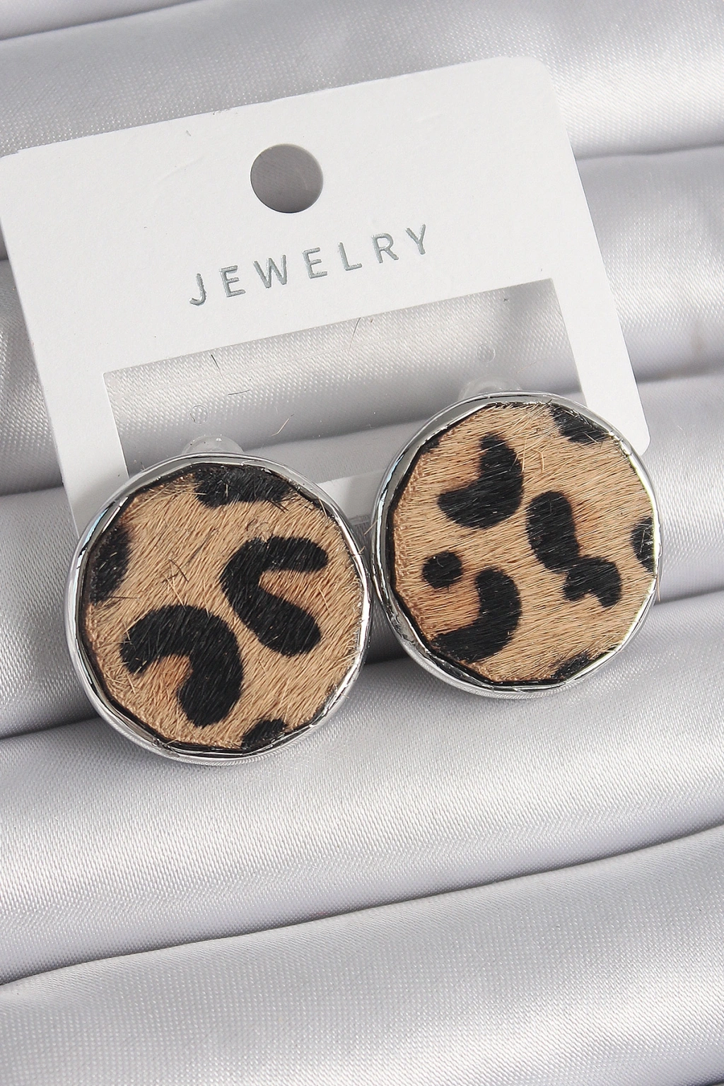 Pirinç Gümüş Renk Daire Plaka Model Leopar Desenli Kadın Küpe