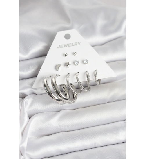 Pirinç Gümüş Renk Halka Modelli 6 Çift Kadın Küpe