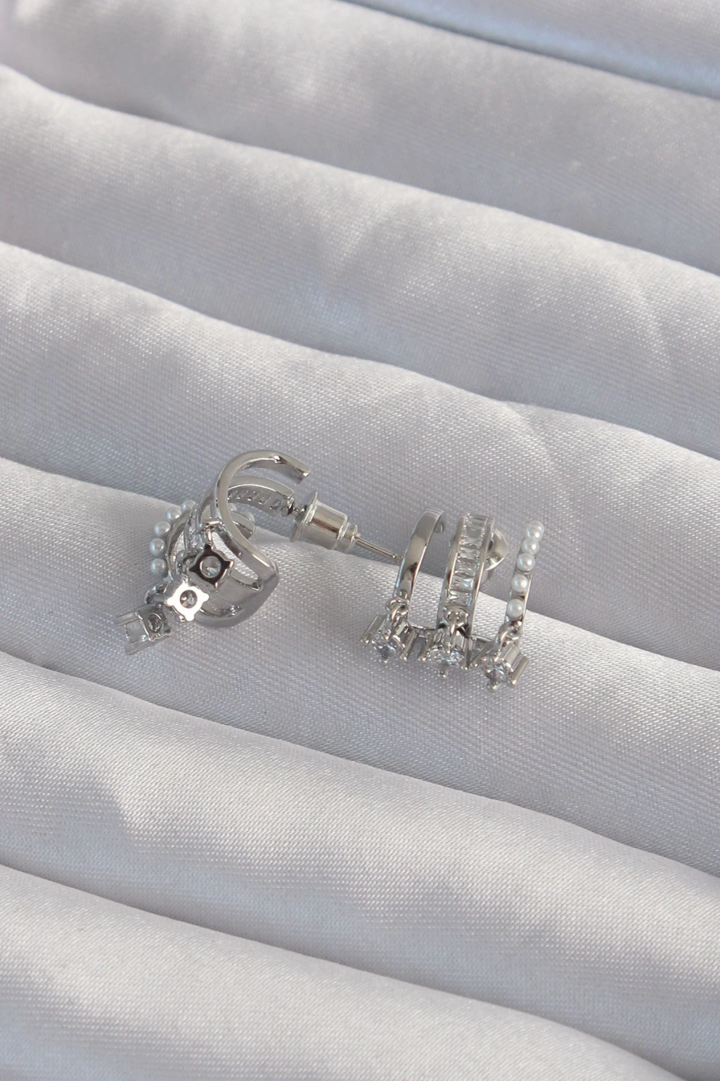 Pirinç Gümüş Renk İncili Çoklu Zirkon Taşlı Yarım Halka Küpe