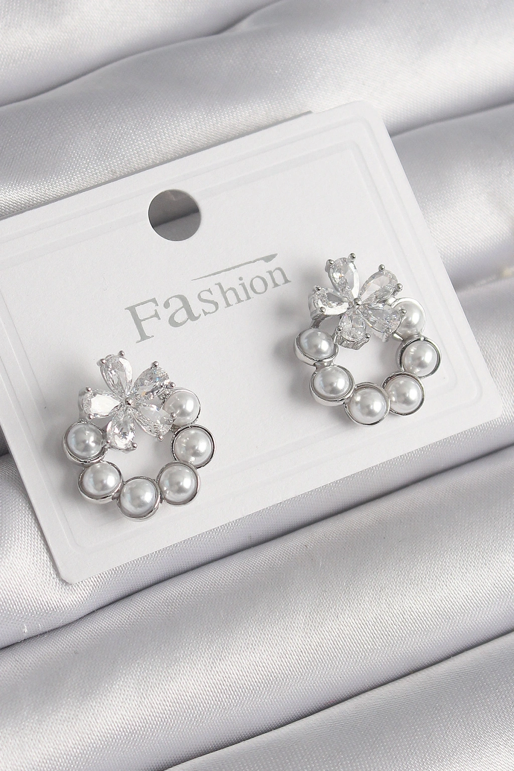 Pirinç Gümüş Renk İncili Halka Model Zirkon Taşlı Çiçek Detay Kadın Küpe