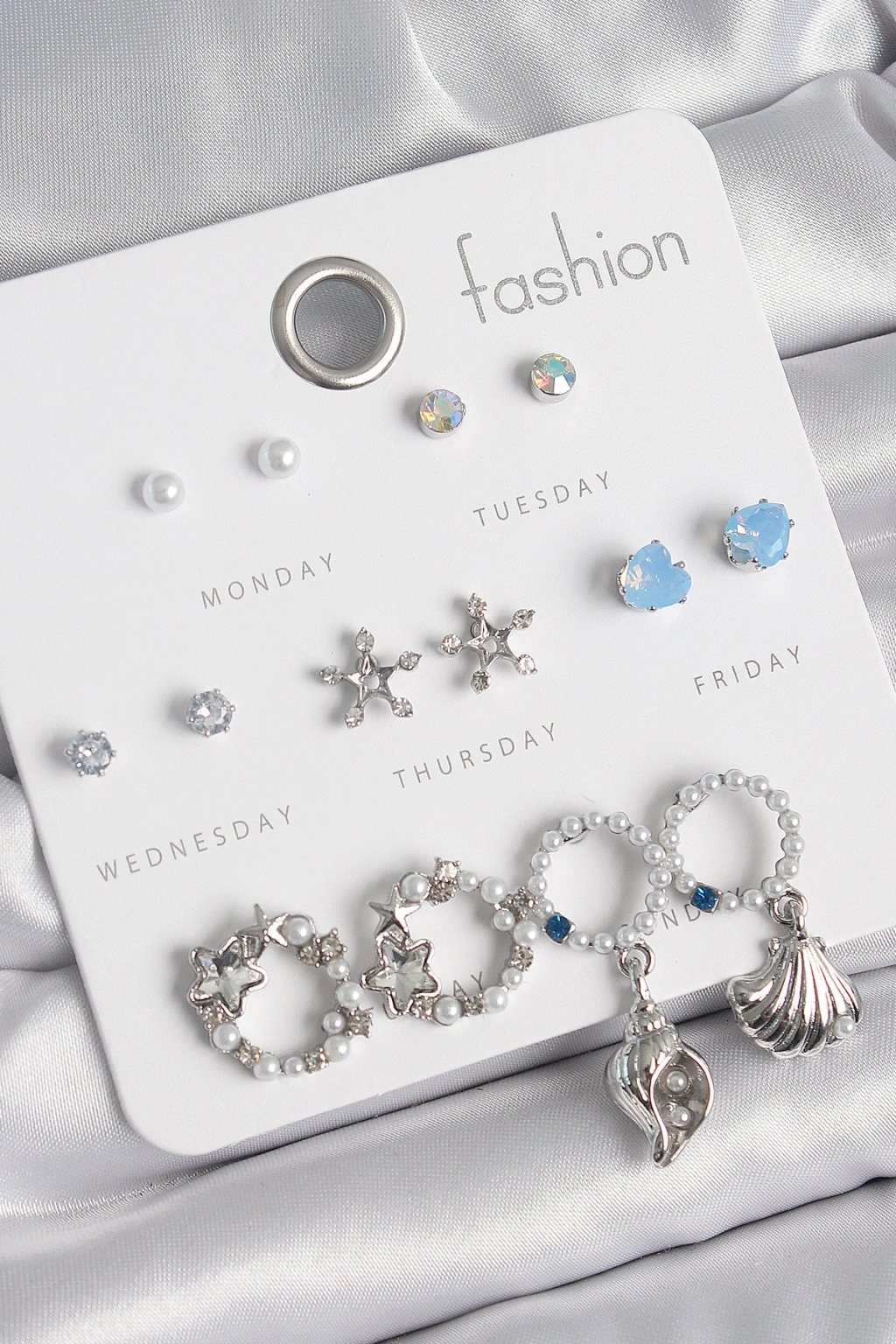 Pirinç Gümüş Renk İncli Zirkon Taşlı Halka Figür Yıldız Detay 7 Çift Kadın Küpe Seti