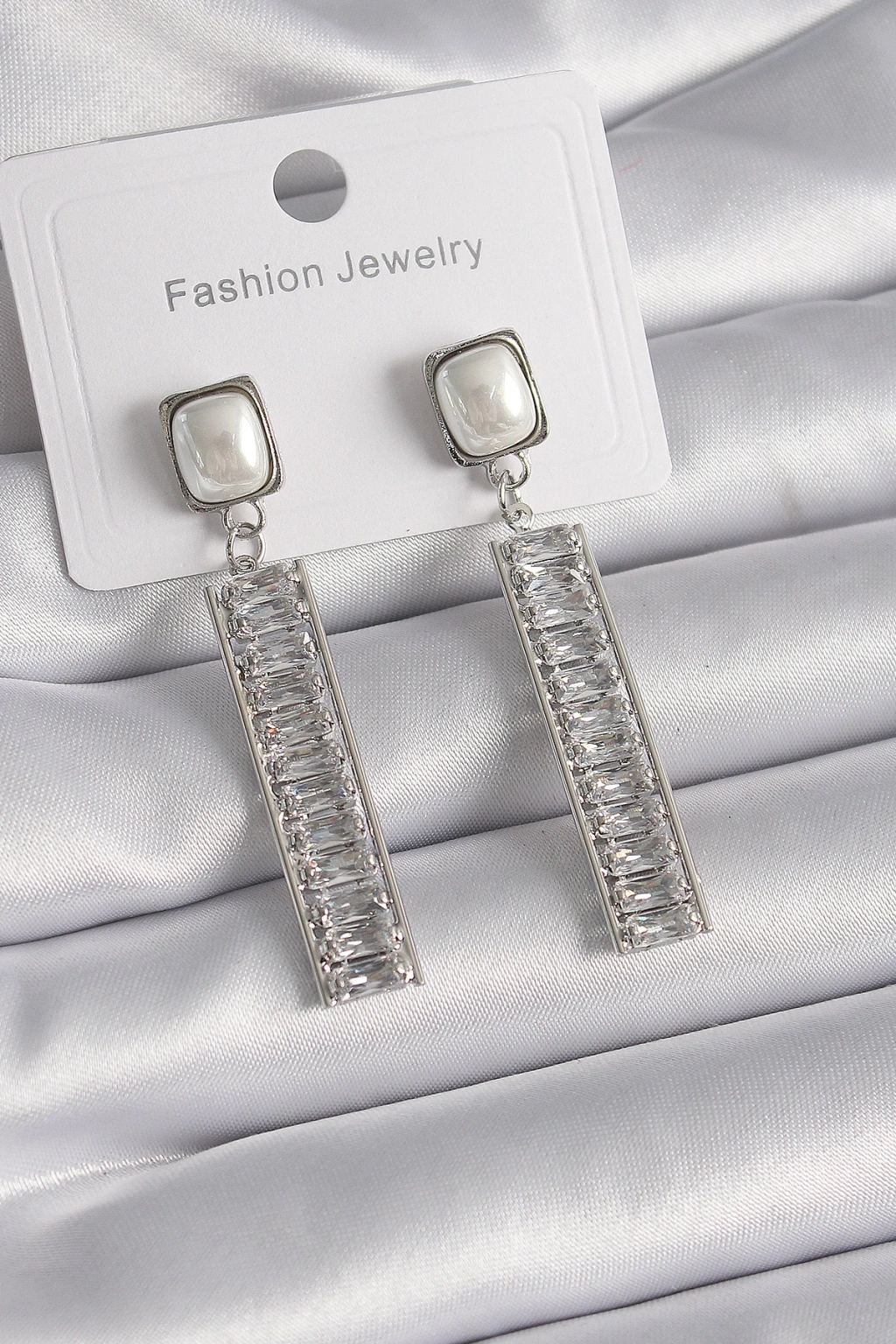 Pirinç Gümüş Renk Kare İnci Zirkon Taşlı Su Yolu Model Kadın Küpe