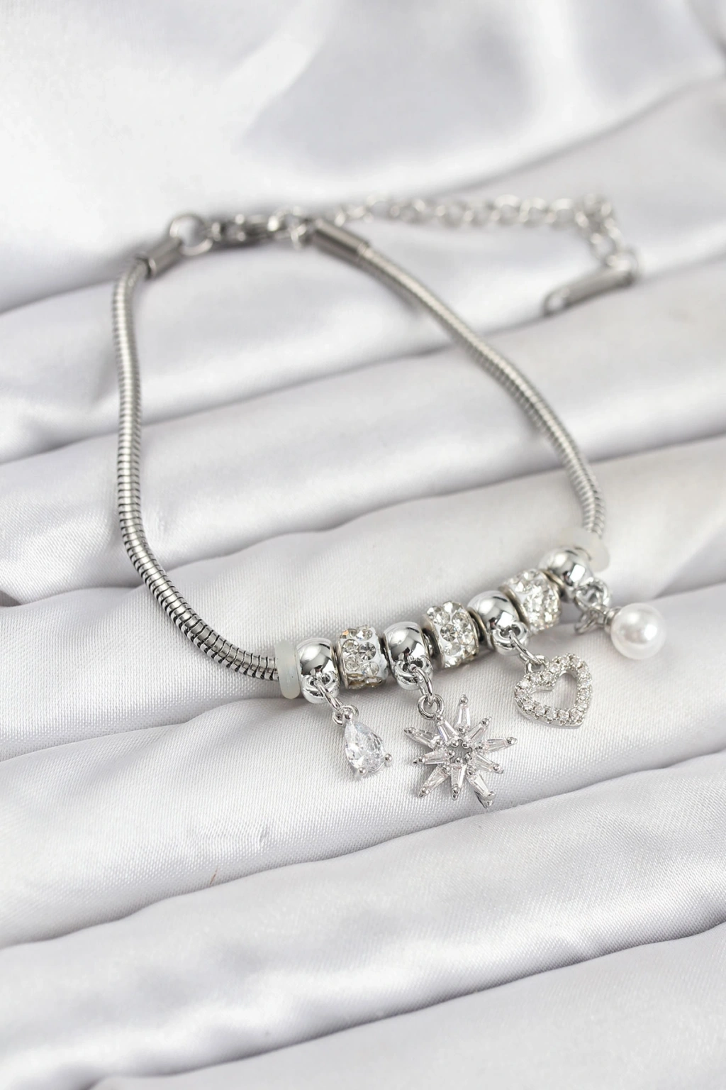 Pirinç Gümüş Renk Kutup Yıldızı ve Kalp Charmlı Kadın Bileklik