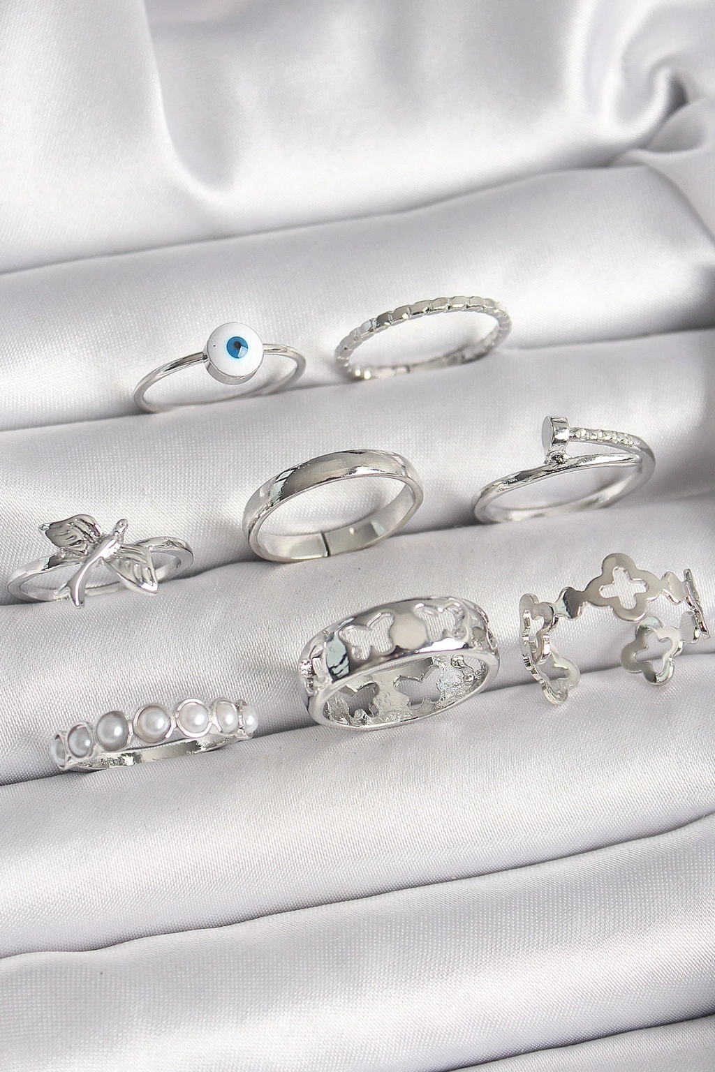 Pirinç Gümüş Renk Nazar Boncuk Detay İncili Kelebek İşlemeli Kadın Yüzük Kombini