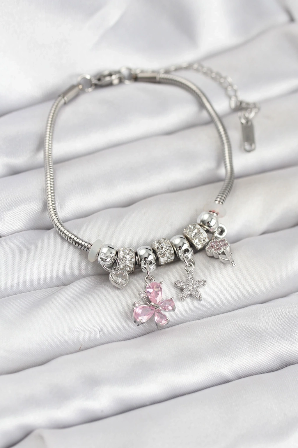Pirinç Gümüş Renk Pembe Kelebek Charmlı Kadın Bileklik