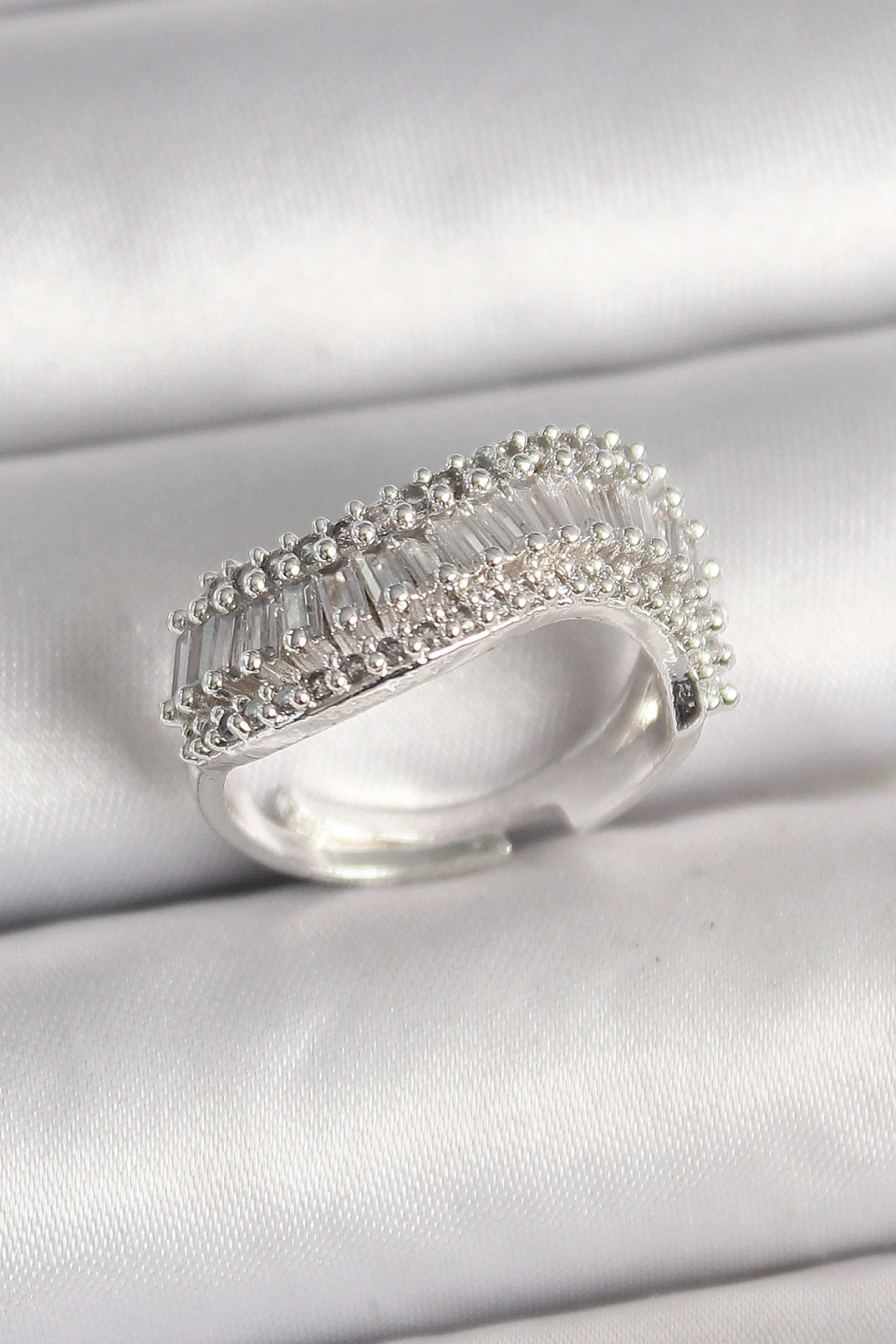 Pirinç Gümüş Renk Su Yolu Zirkon Dalga Model Ayarlanabilir Kadın Yüzük