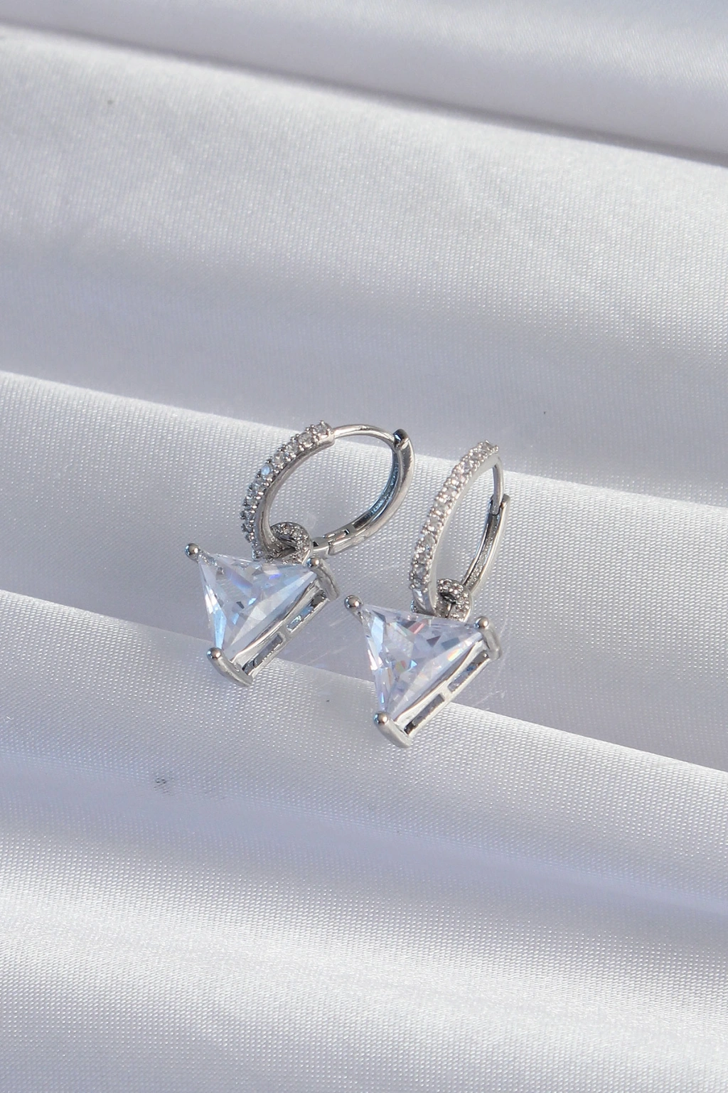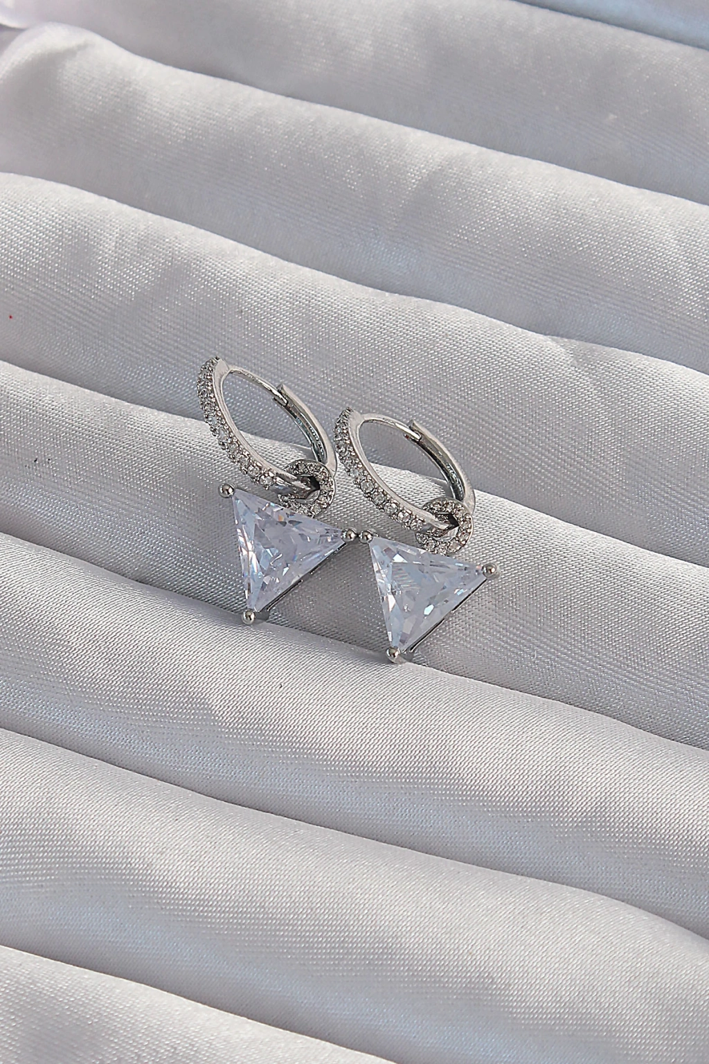 Pirinç Gümüş Renk Üçgen Zirkon Taşlı Sallantılı Halka Küpe