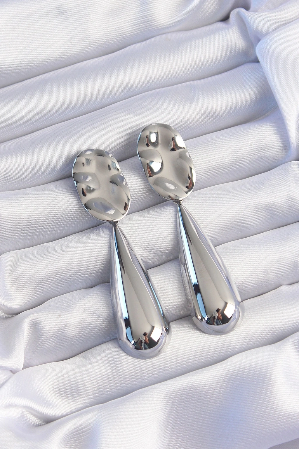 Pirinç Gümüş Renk Uzun Bombeli Ezme Plaka Küpe