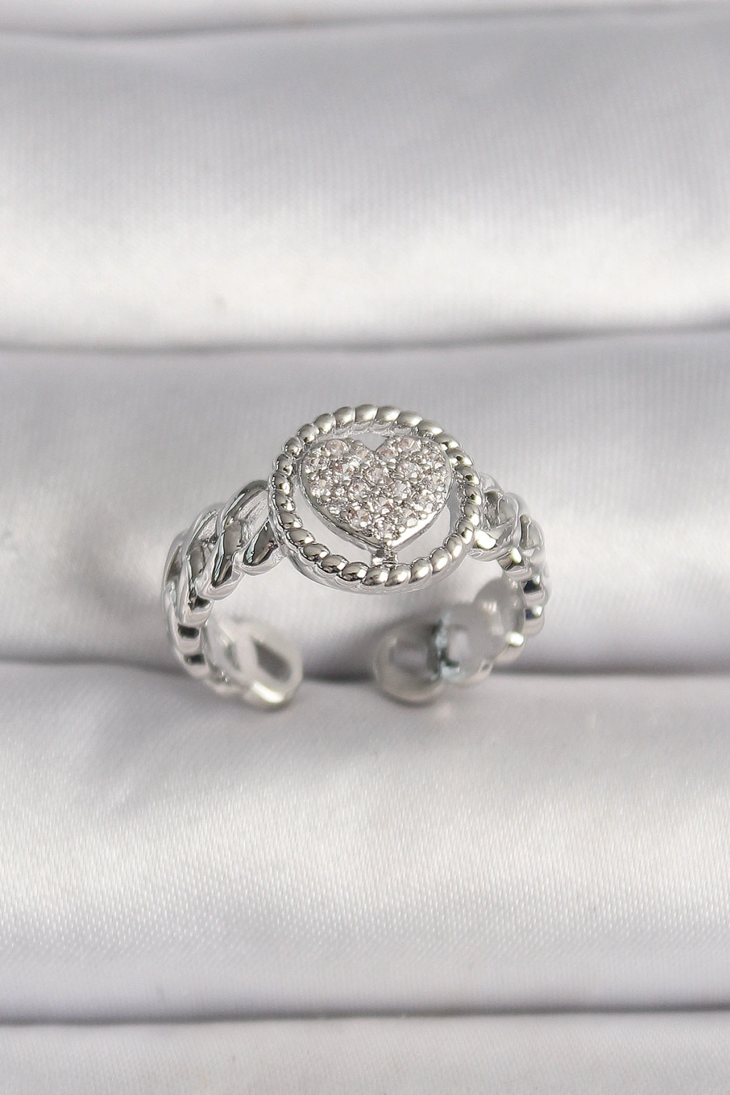 Pirinç Gümüş Renk Zincir Model Zirkon Taşlı Kalp Model Kadın Yüzük