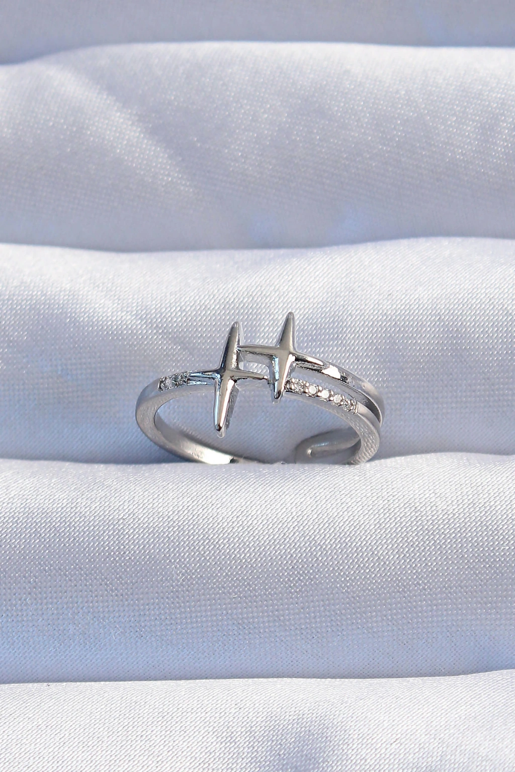 Pirinç Gümüş Renk Zirkon Taşlı 2li Görünüm Ayarlanabilir Yıldız Model Yüzük