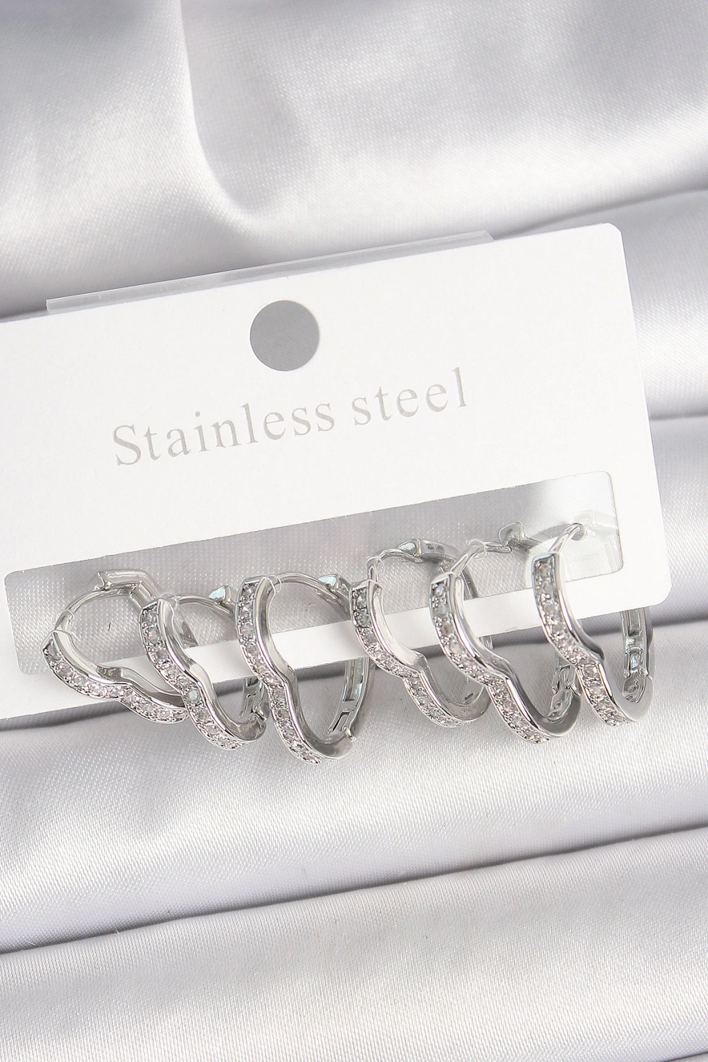 Pirinç Gümüş Renk Zirkon Taşlı 3 Çift Kalp Model Kadın Küpe