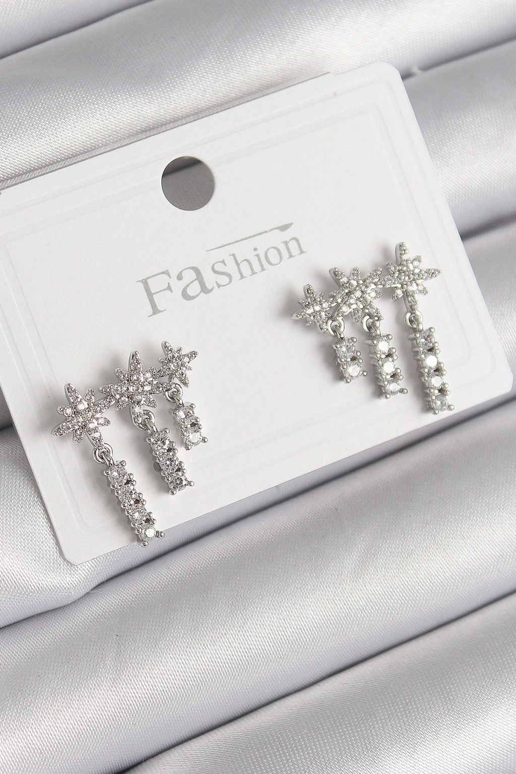 Pirinç Gümüş Renk Zirkon Taşlı 3'lü Sallantı Yıldız Model Kadın Küpe
