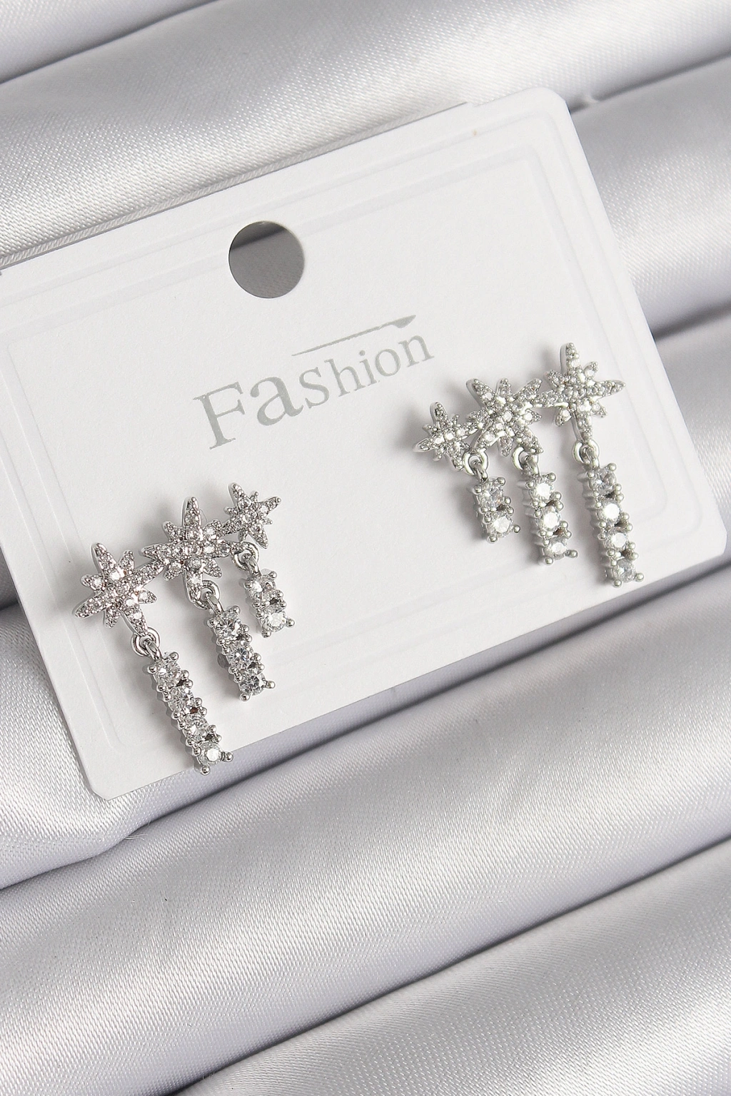 Pirinç Gümüş Renk Zirkon Taşlı 3'Lü Sallantı Yıldız Model Kadın Küpe