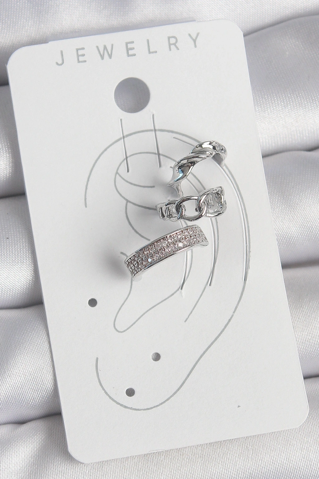 Pirinç Gümüş Renk Zirkon Taşlı 3'lü Zincir Sarmal Model Kadın Kıkırdak Küpe