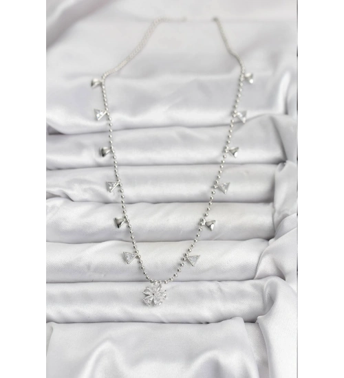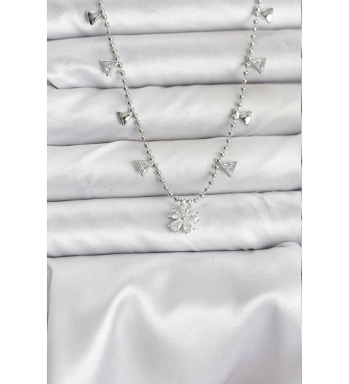 Pirinç Gümüş Renk Zirkon Taşlı Çiçek Model Kadın Kolye