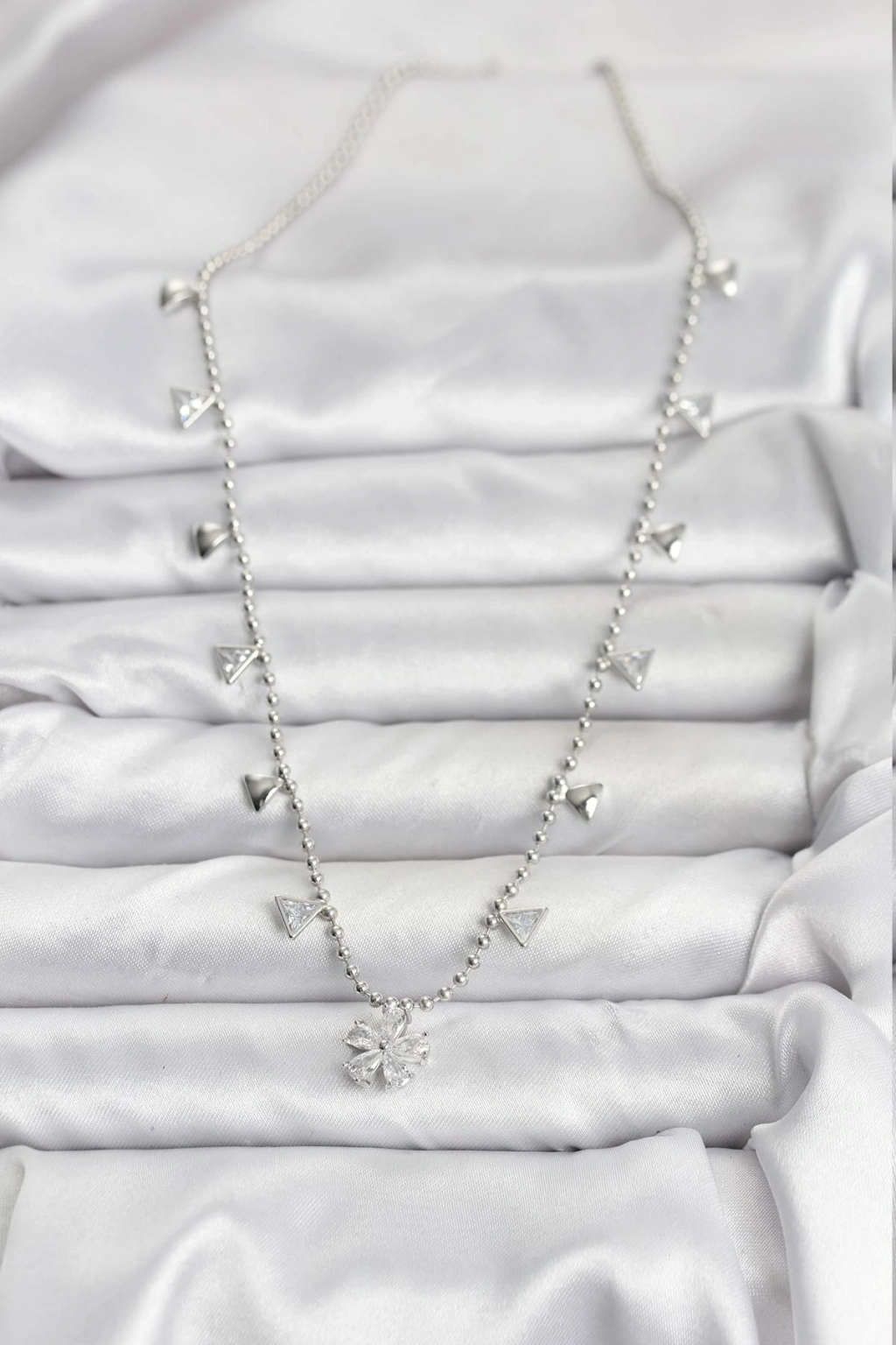 Pirinç Gümüş Renk Zirkon Taşlı Çiçek Model Kadın Kolye