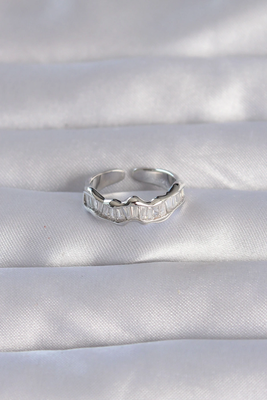 Pirinç Gümüş Renk Zirkon Taşlı Dalgalı Su Yolu Model Ayarlanabilir Yüzük