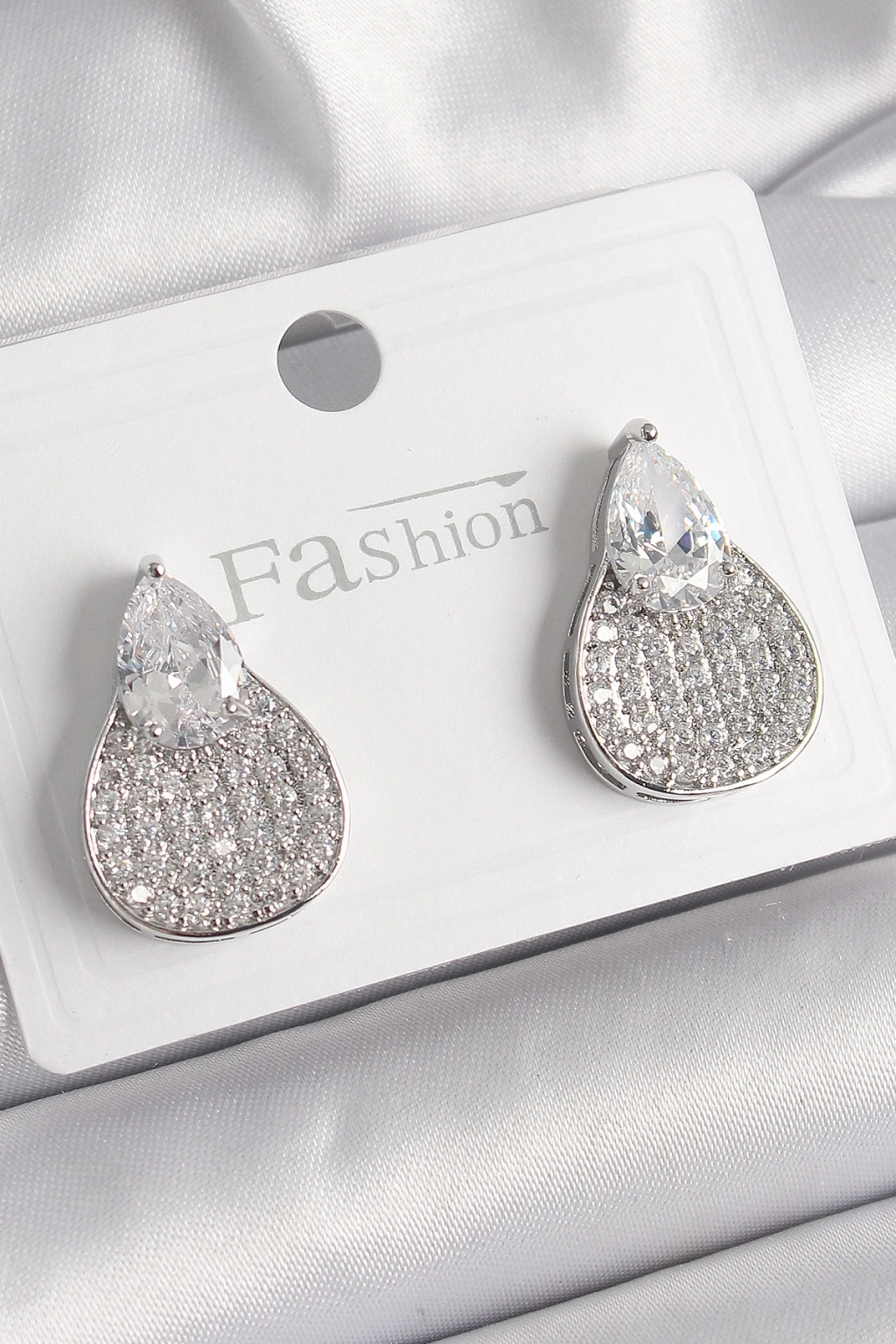 Pirinç Gümüş Renk Zirkon Taşlı Damla Model Kadın Küpe