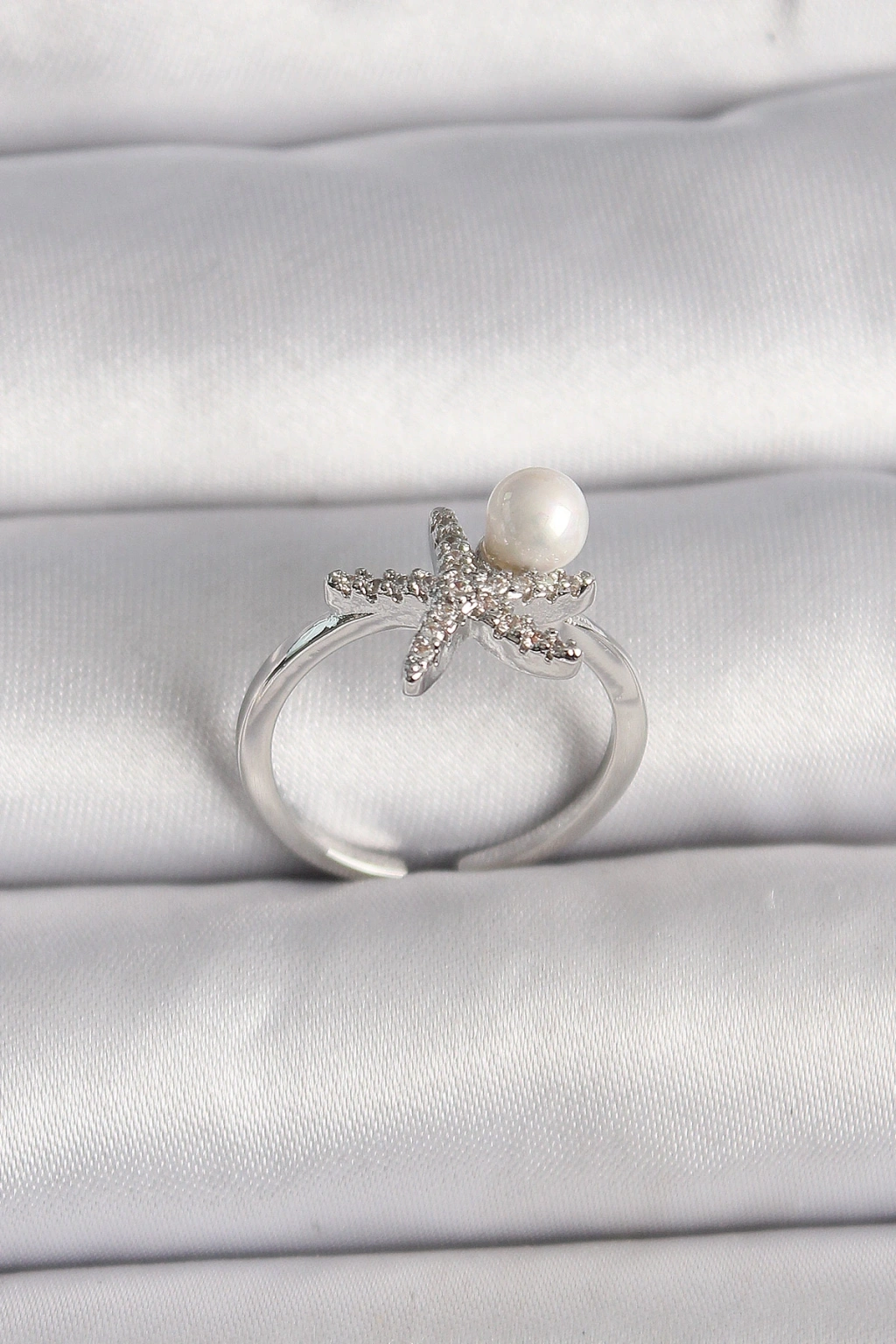 Pirinç Gümüş Renk Zirkon Taşlı Deniz Yıldızı Model İnci Detay Ayarlanabilir Yüzük