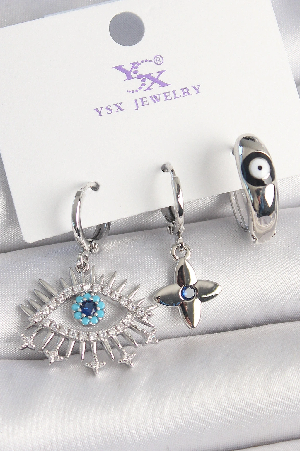 Pirinç Gümüş Renk Zirkon Taşlı Göz Model Nazar Boncuk Detay 3'lü Kadın Kombin Küpe