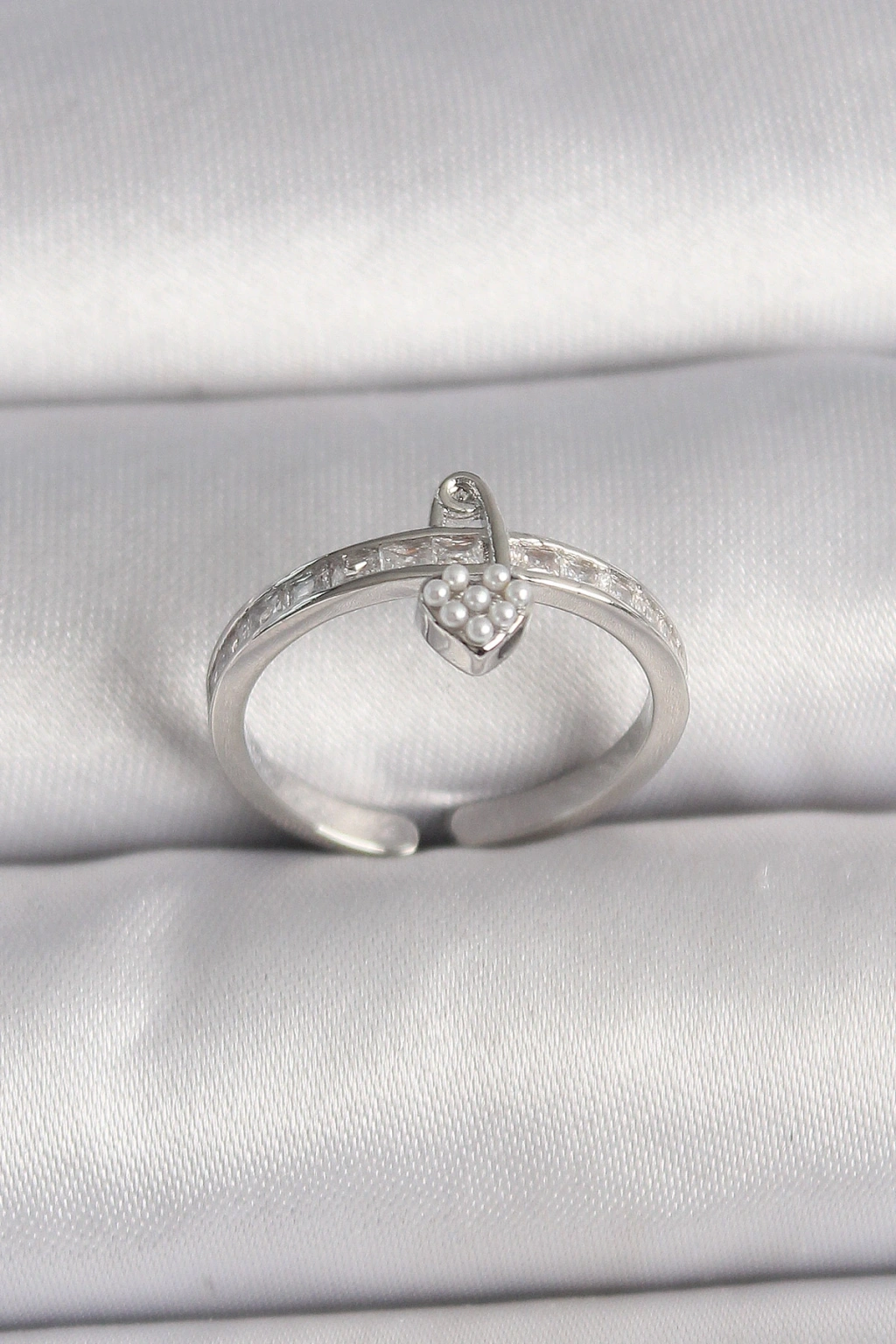Pirinç Gümüş Renk Zirkon Taşlı İnci Detaylı Kilit Kalp Model Ayarlanabilir Yüzük