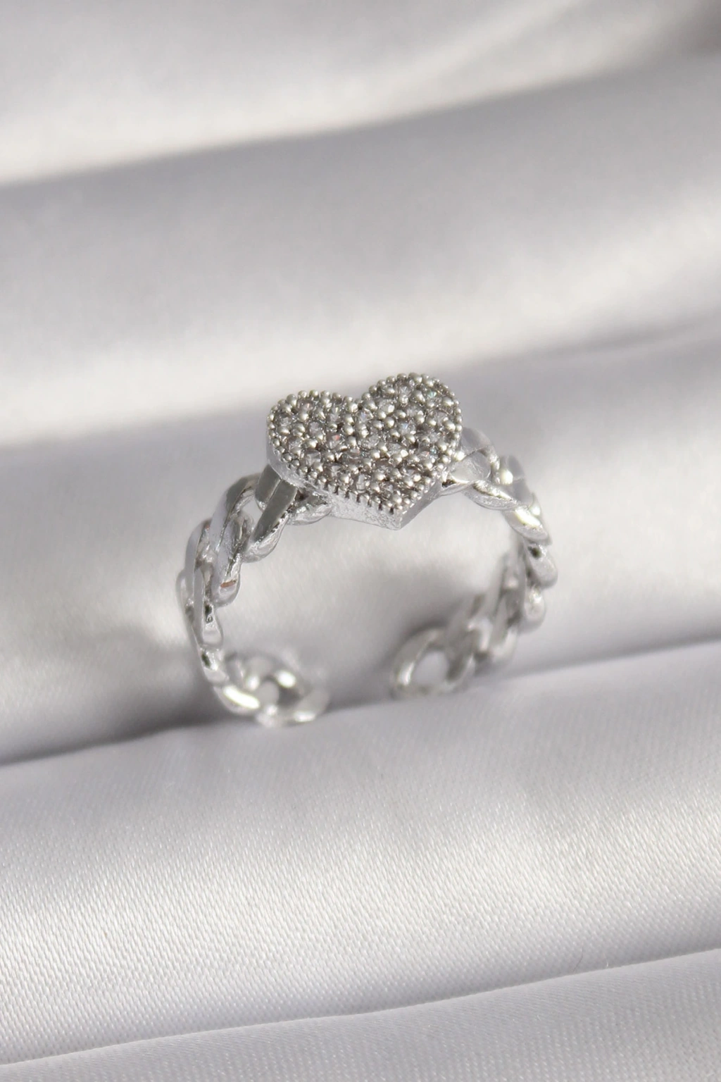 Pirinç Gümüş Renk Zirkon Taşlı Kalp Model Kadın Yüzük