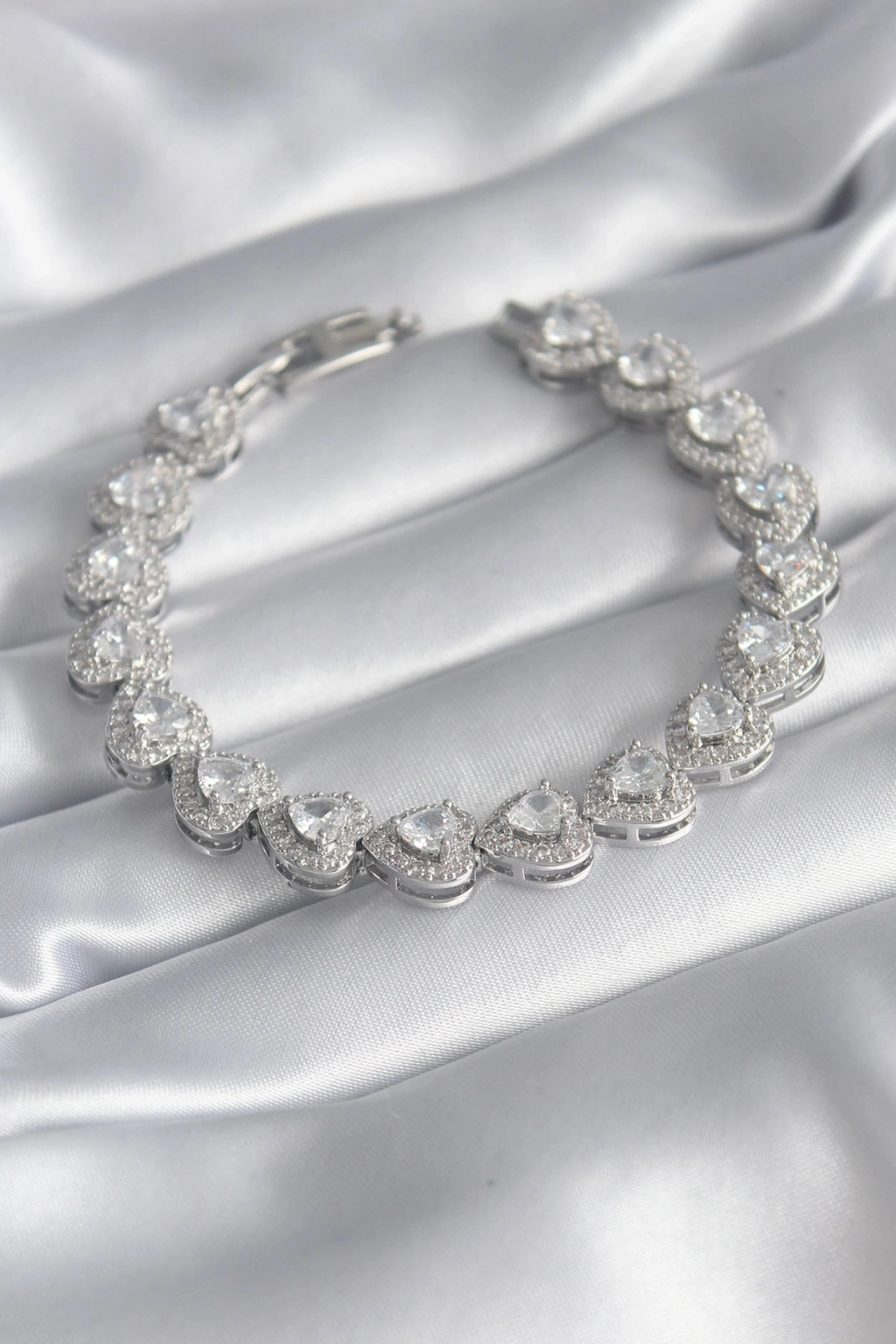 Pirinç Gümüş Renk Zirkon Taşlı Kalp Model VIP Seri Kadın Bileklik