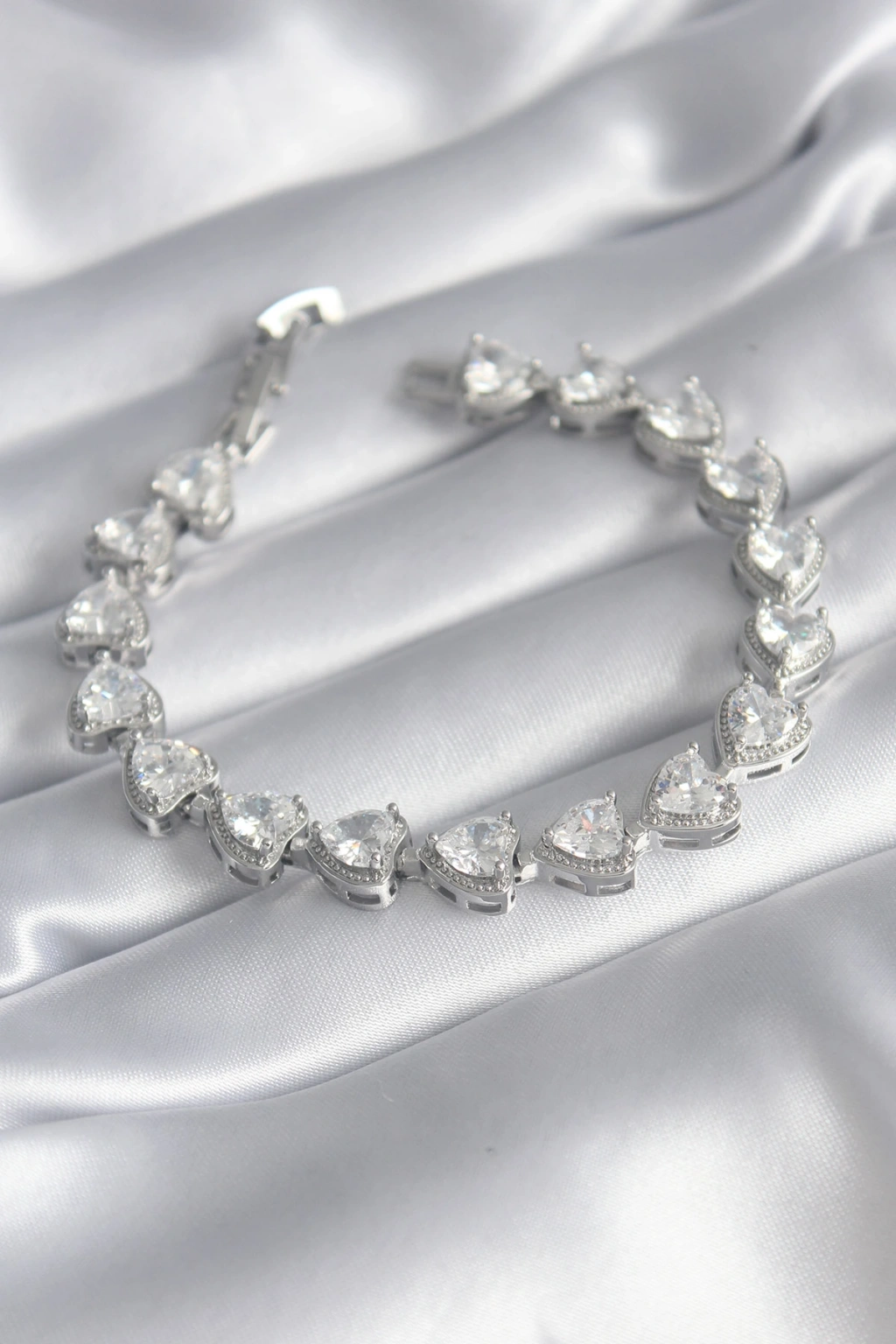 Pirinç Gümüş Renk Zirkon Taşlı Kalp Model VIP Seri Kadın Bileklik