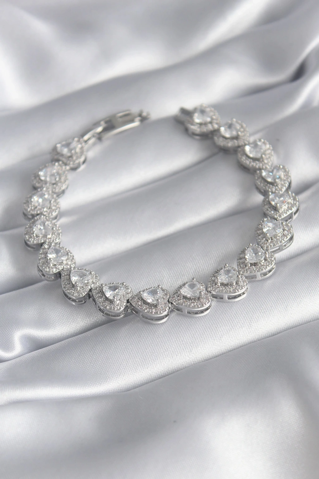 Pirinç Gümüş Renk Zirkon Taşlı Kalp Model Vıp Seri Kadın Bileklik