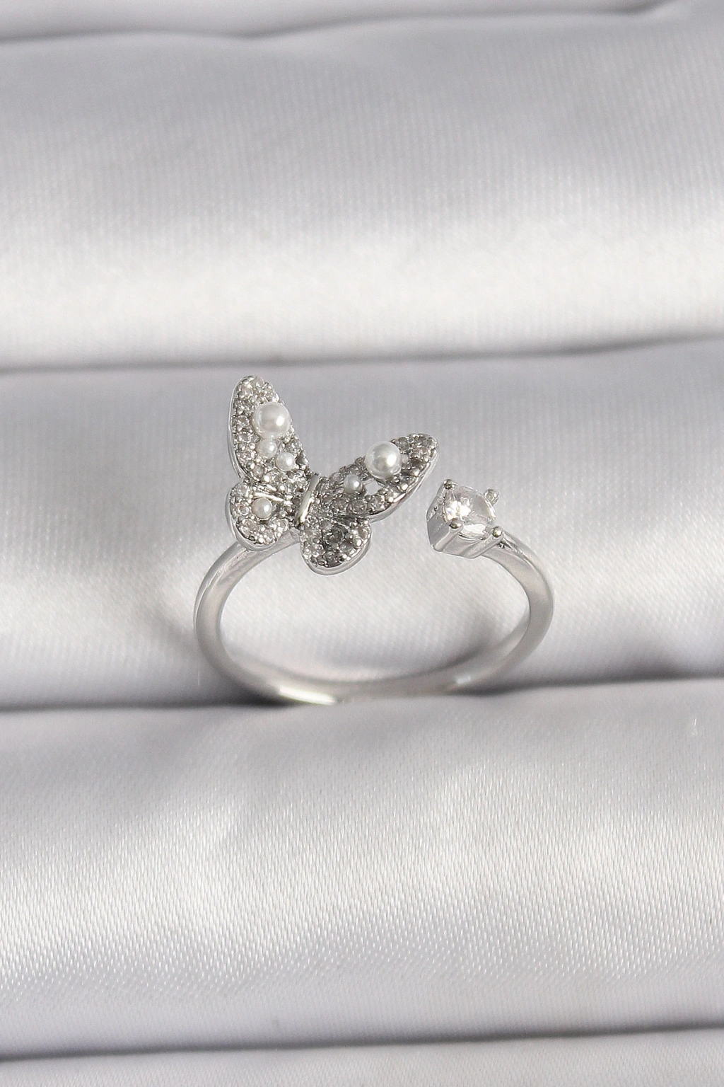 Pirinç Gümüş Renk Zirkon Taşlı Kelebek Model İnci Detay Ayarlanabilir Yüzük