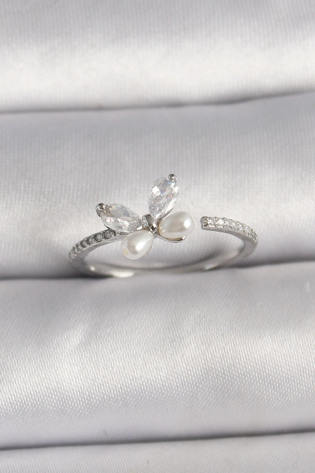 Pirinç Gümüş Renk Zirkon Taşlı Kelebek Model İnci Detaylı Ayarlanabilir Yüzük