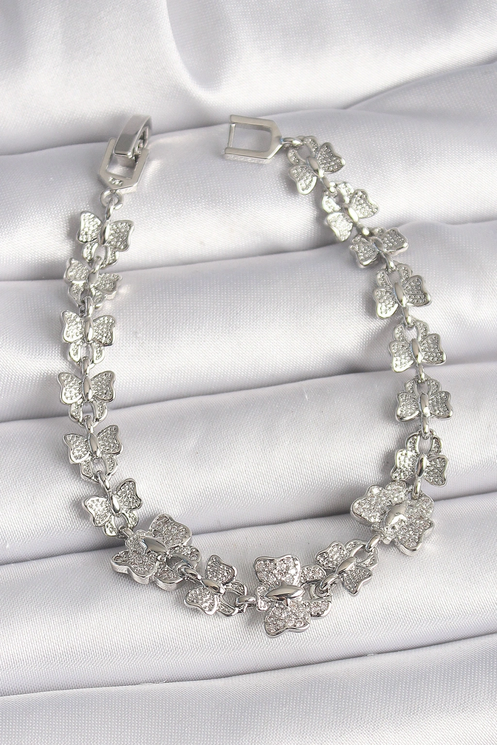 Pirinç Gümüş Renk Zirkon Taşlı Kelebek Model Zincir Kadın Bileklik