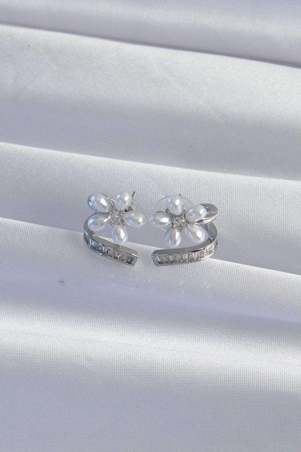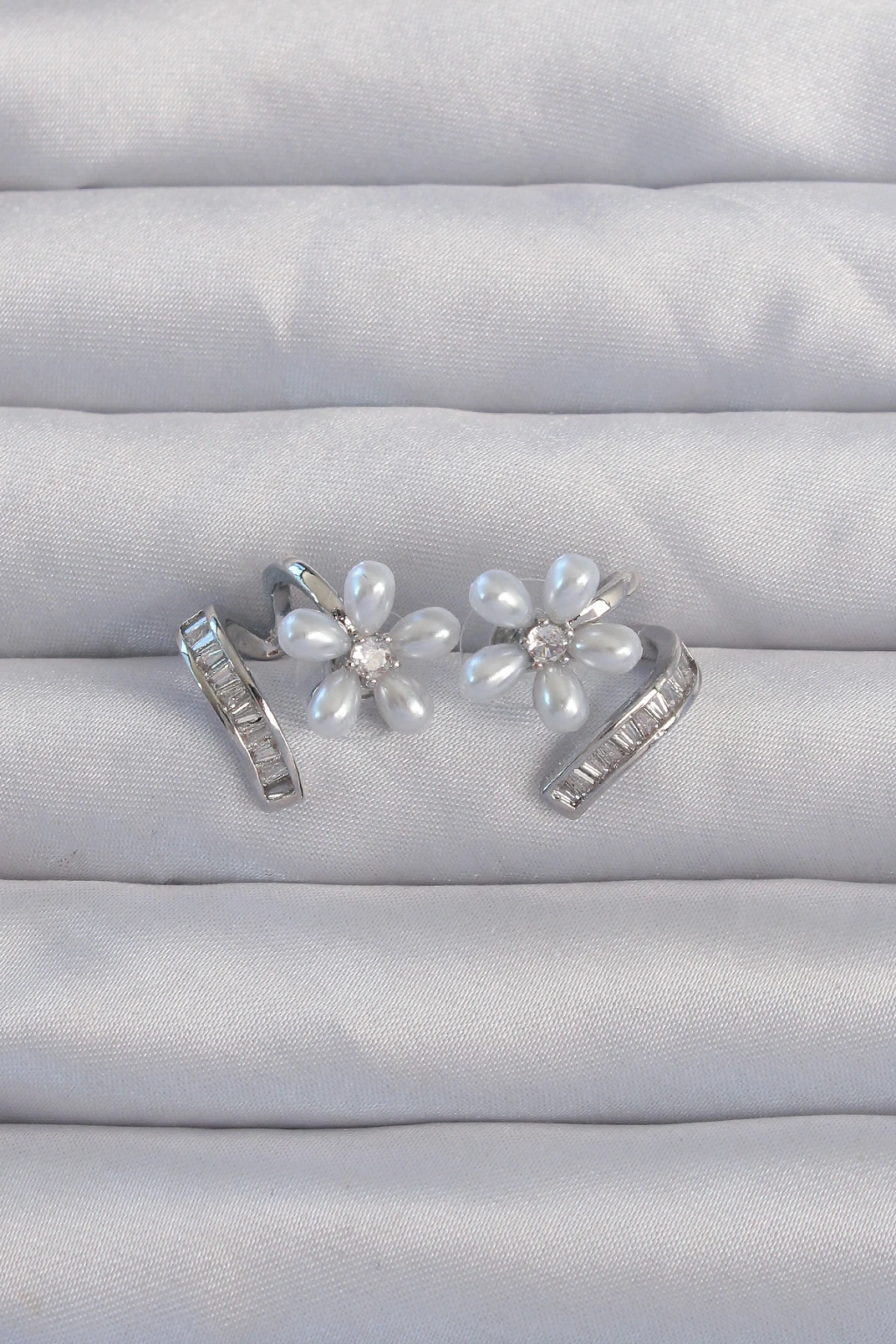 Pirinç Gümüş Renk Zirkon Taşlı Kıvrımlı İnci Çiçek Küpe