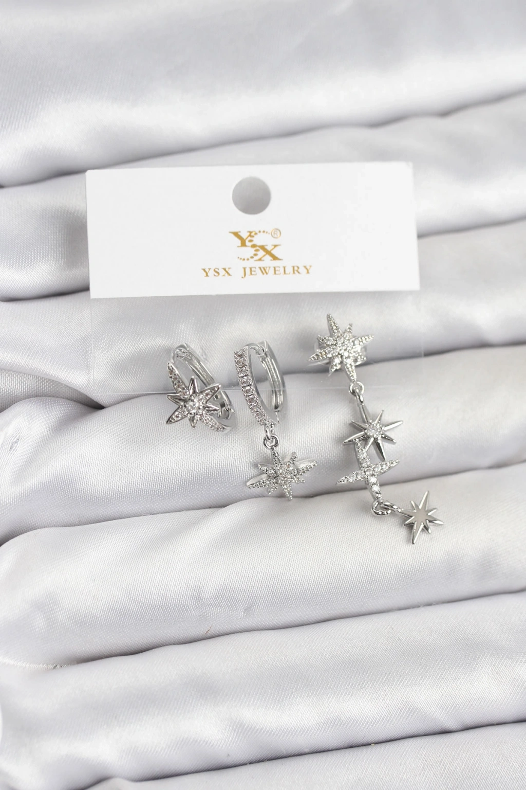 Pirinç Gümüş Renk Zirkon Taşlı Kutup Yıldızı Model YSX Trio Küpe Seti