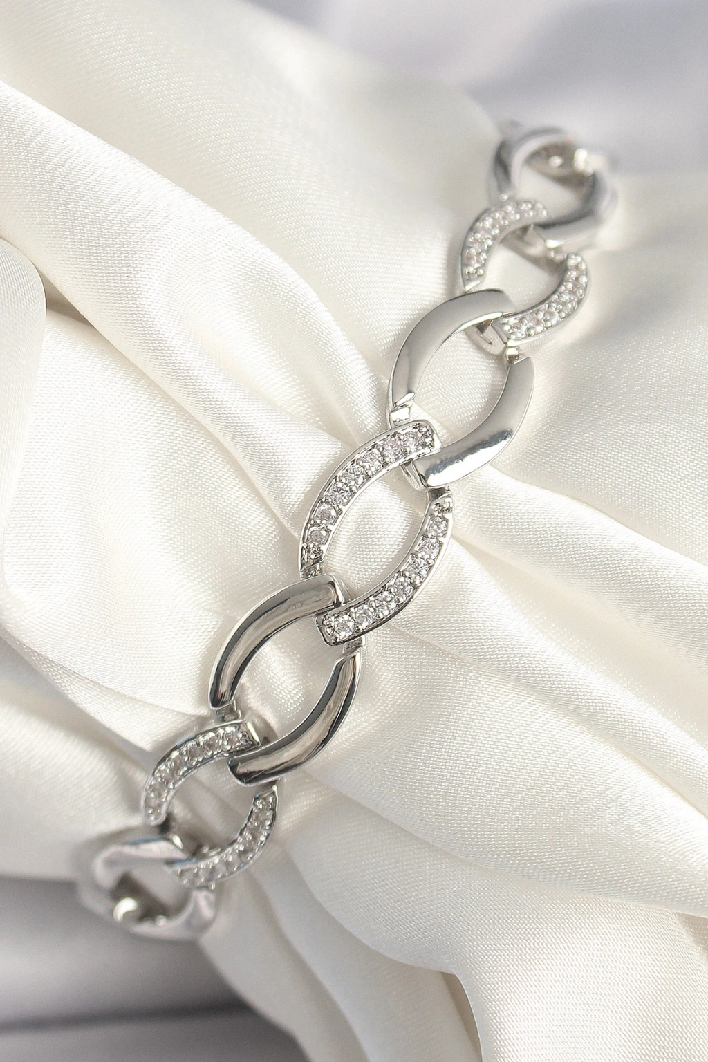 Pirinç Gümüş Renk Zirkon Taşlı Oval Zincir Model Kadın Bileklik
