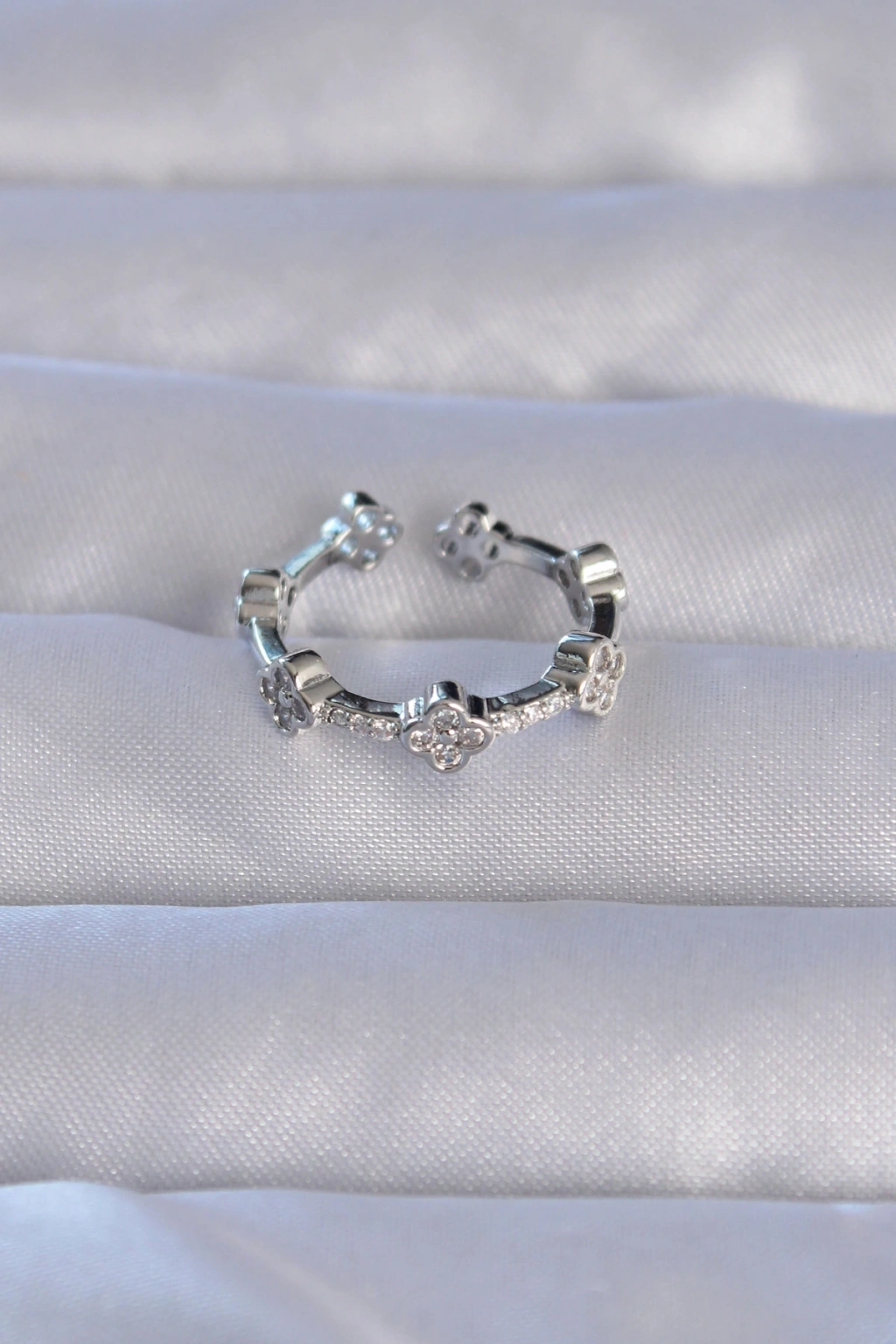 Pirinç Gümüş Renk Zirkon Taşlı Yonca Model Ayarlanabilir Yüzük