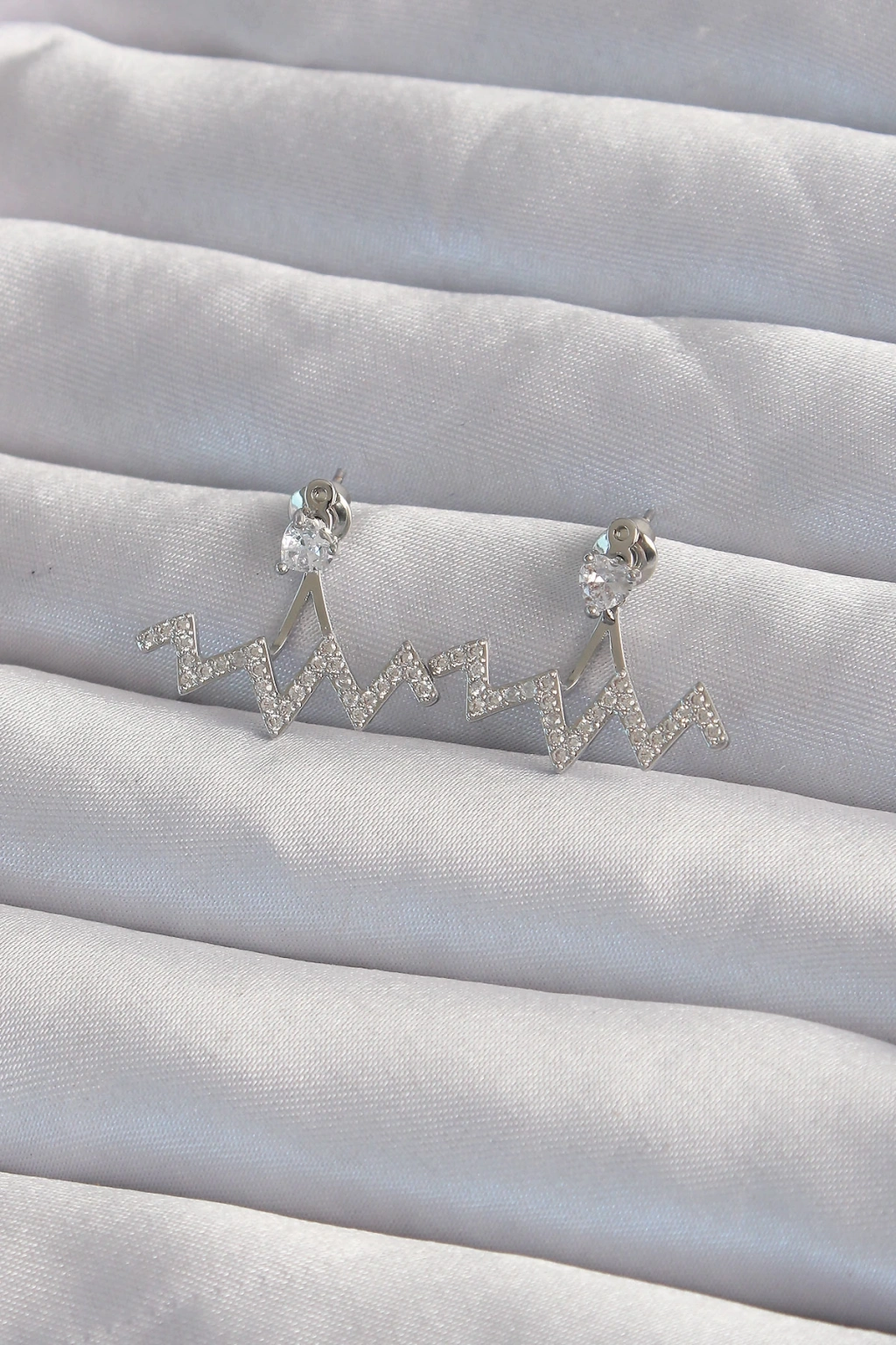 Pirinç Gümüş Renk Zirkon Taşlı Zikzak Küpe