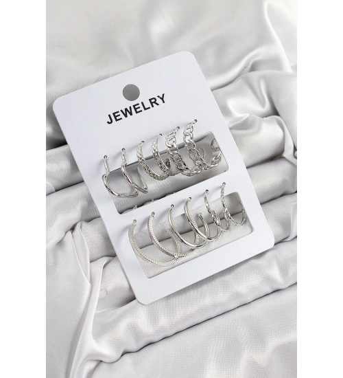 Pirinç Karışık Halka Model Gümüş Renk 6 Çift Kadın Küpe Set