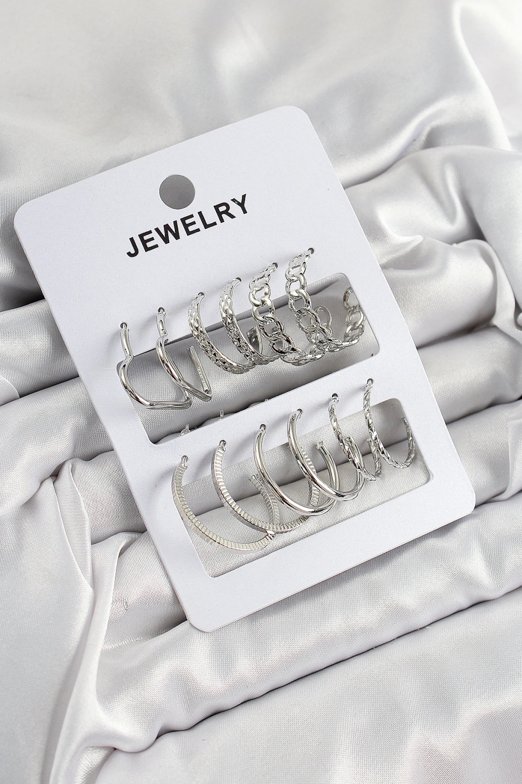 Pirinç Karışık Halka Model Gümüş Renk 6 Çift Kadın Küpe Set