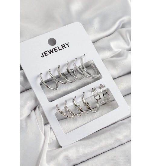 Pirinç Karışık Halka Model Gümüş Renk 6 Çift Kadın Küpe Set