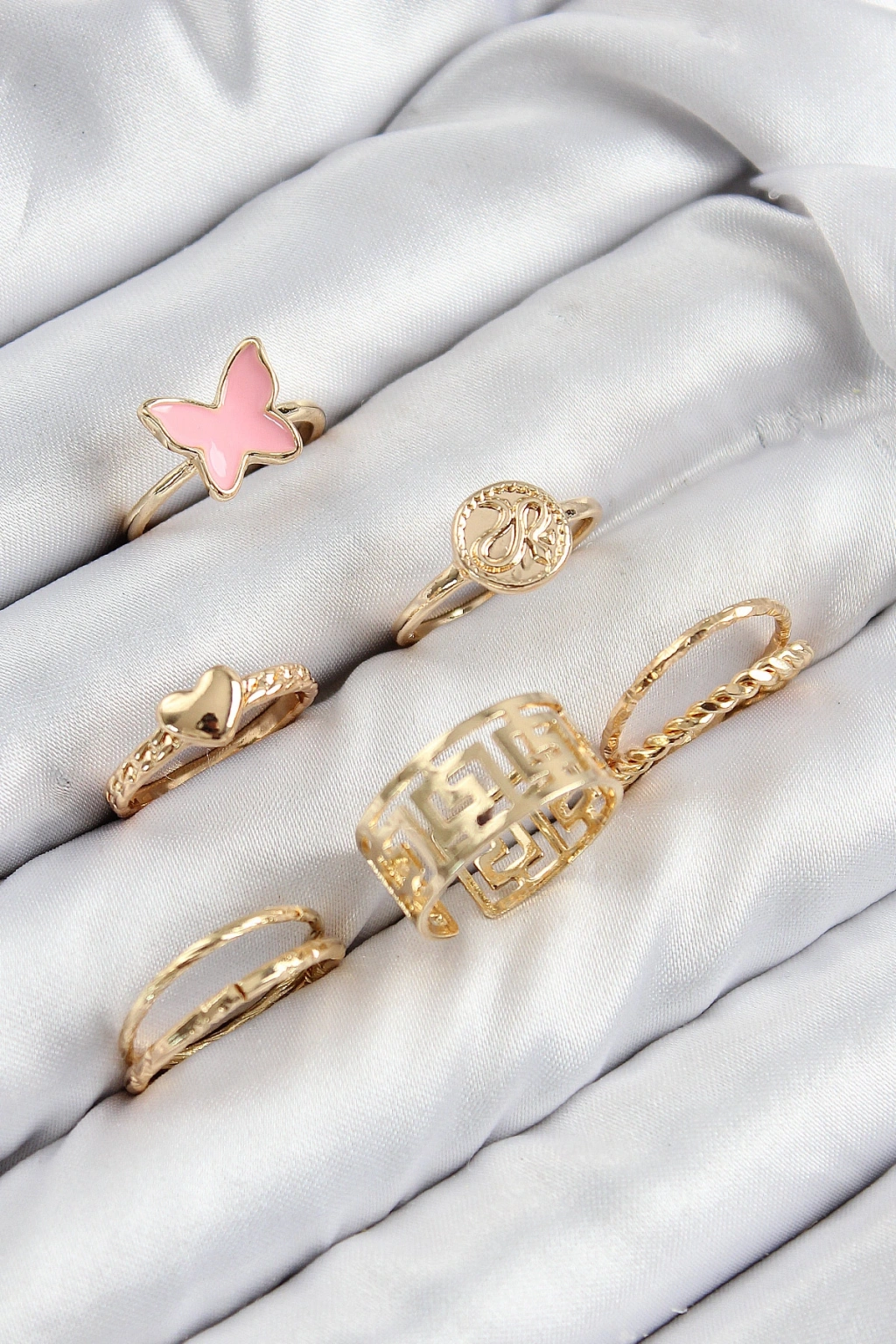 Pirinç Kelebek Ve Kalp Model Gold Renk Kadın Yüzük Kombin Set