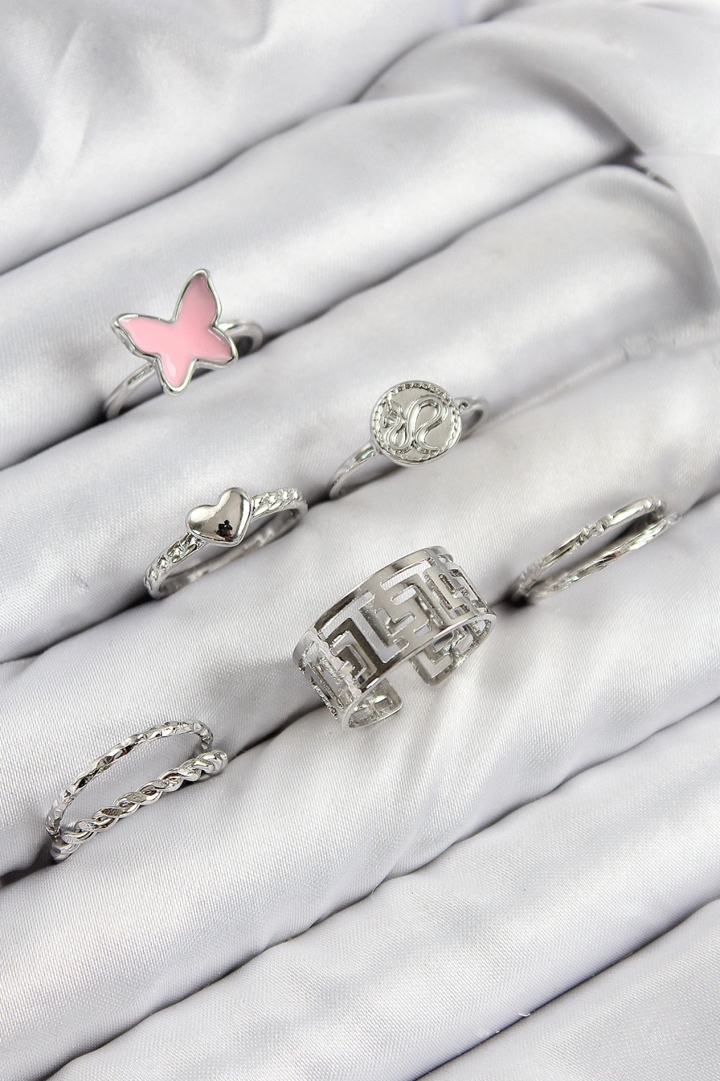 Pirinç Kelebek Ve Kalp Model Gümüş Renk Kadın Yüzük Kombin Set
