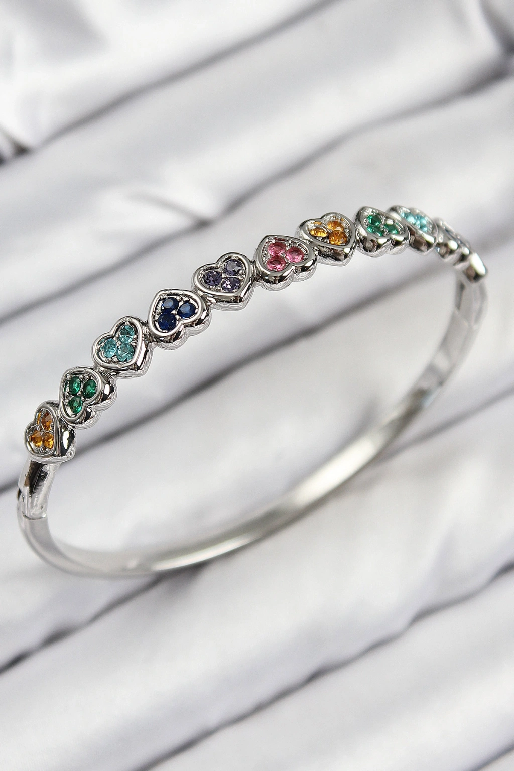 Pirinç Renkli Zirkon Taşlı Sıralı Kalp Model Gümüş Renk Kadın Kelepçe