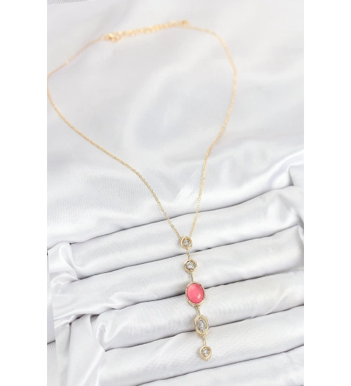 Pirinç Zincir Pembe Gold Renk Zirkon Taşlı Y Kolye