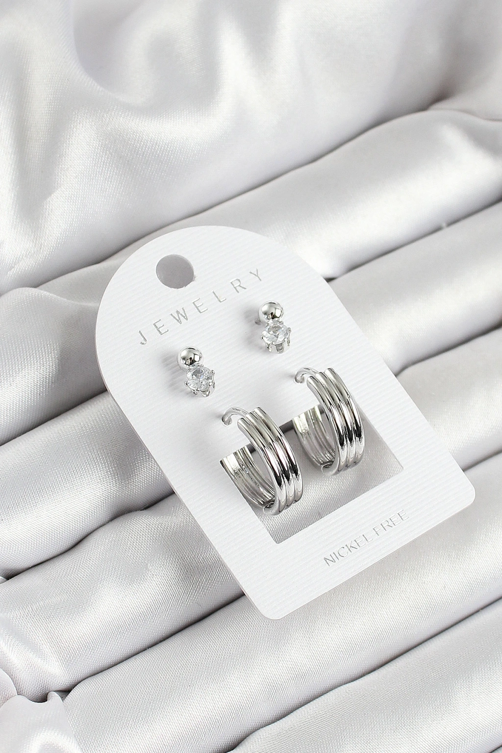 Pirinç Zirkon Taş Ve Halka Figürlü Gümüş Renk 3'lü Çift Kadın Küpe Set
