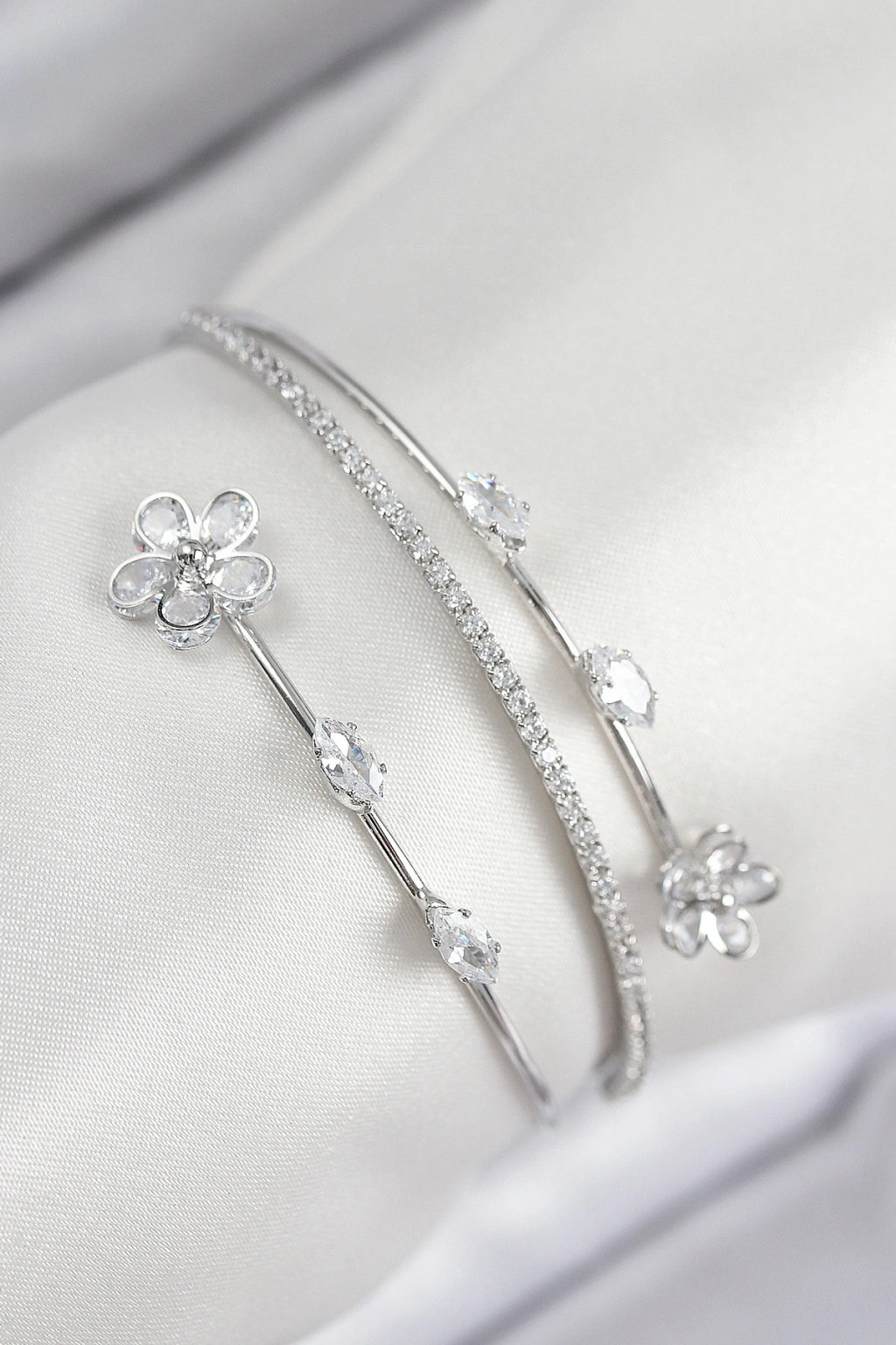 Pirinç Zirkon Taşlı Çiçek Model Gümüş Renk Kadın Bileklik