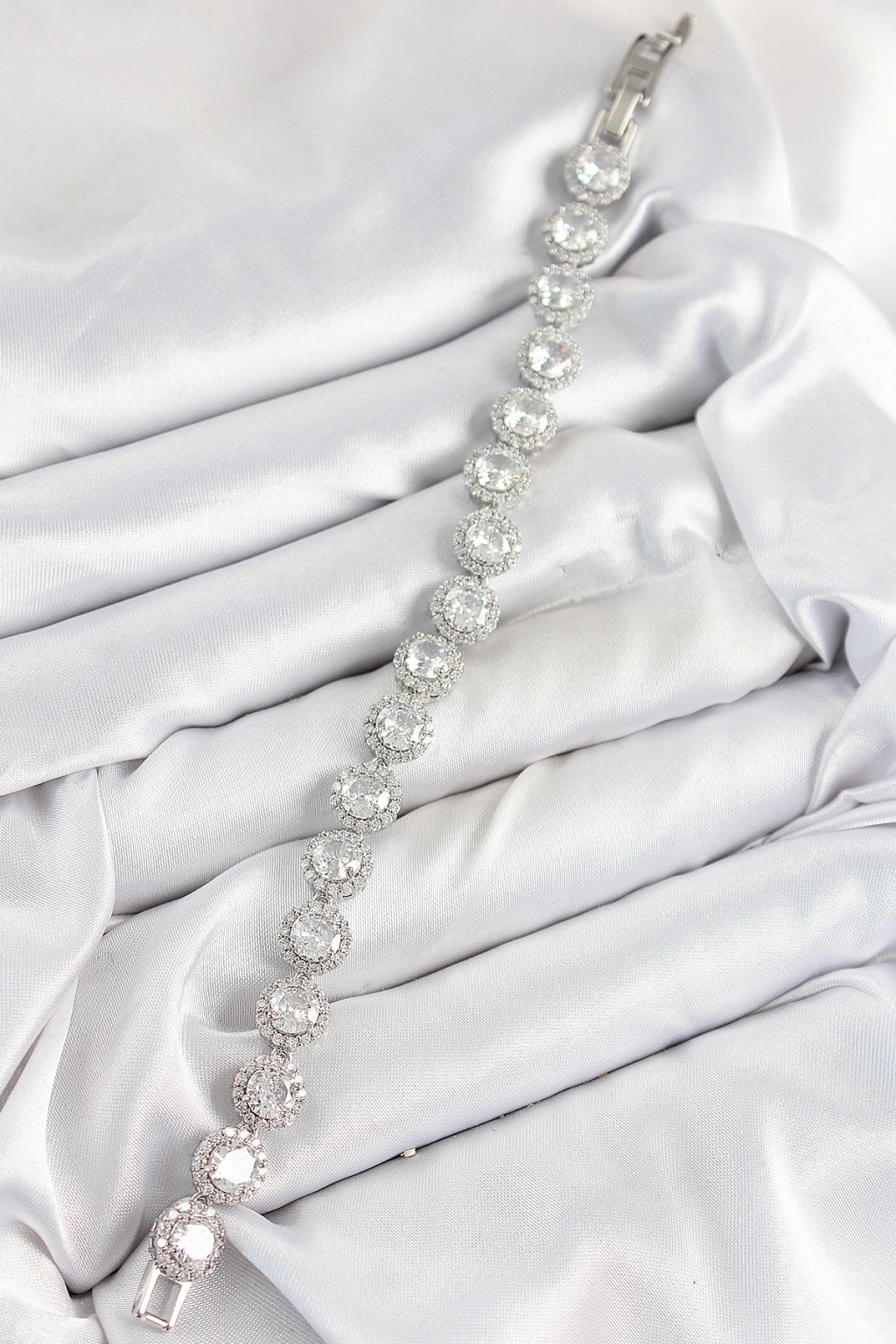 Pirinç Zirkon Taşlı Daire Baget Model Gümüş Renk VIP Seri Kadın Bileklik