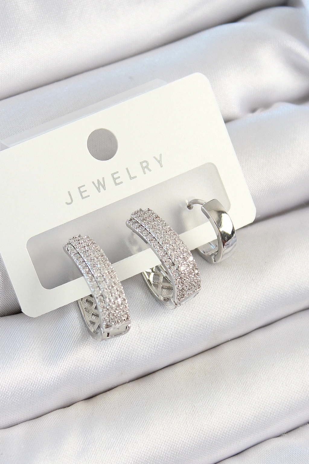 Pirinç Zirkon Taşlı Damla Model Gümüş Renk 3'lü Çift Kadın Küpe Set
