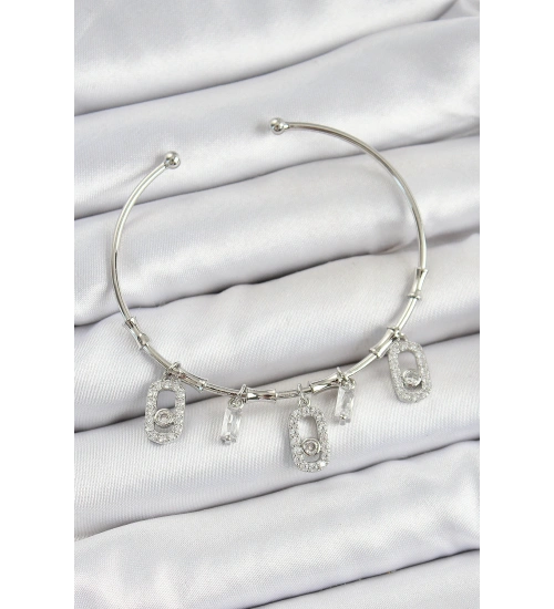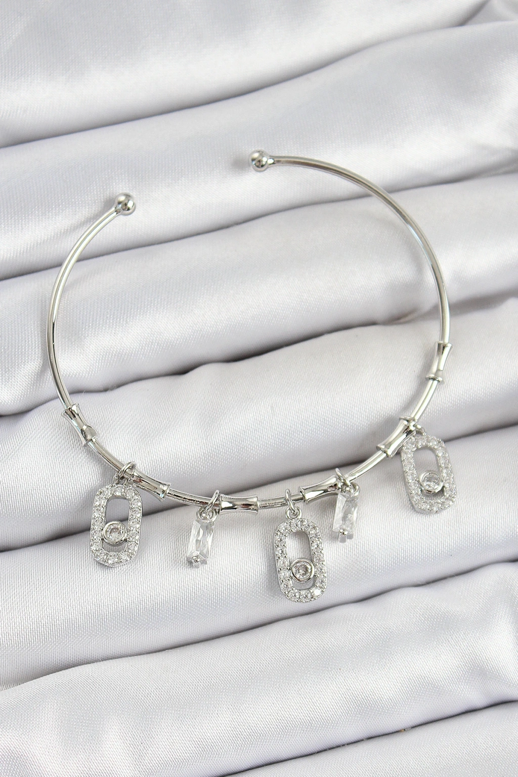 Pirinç Zirkon Taşlı Dikdörtgen Model Gümüş Renk Charm Bileklik