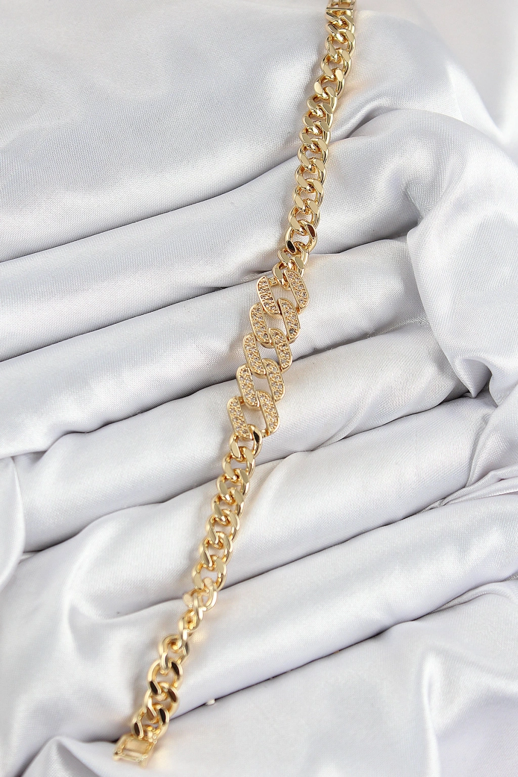 Pirinç Zirkon Taşlı Ezme Küba Zincir Model Gold Renk Kadın Bileklik
